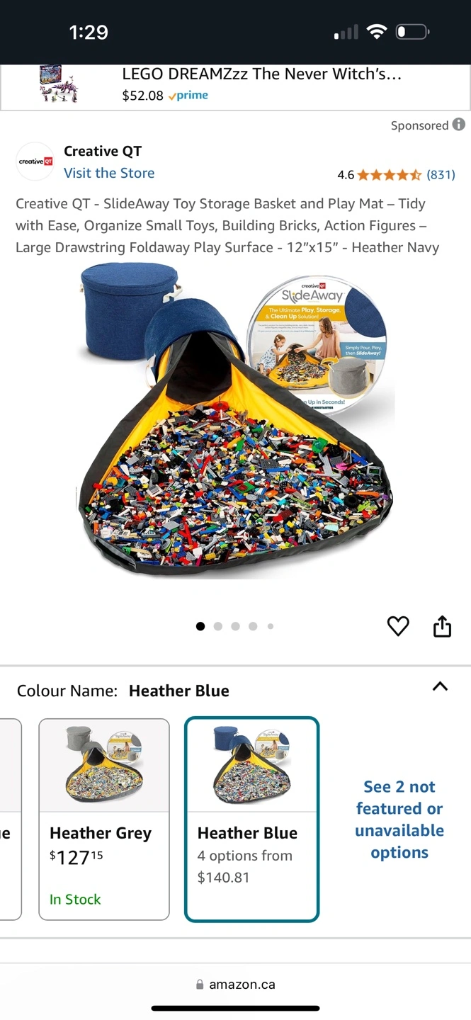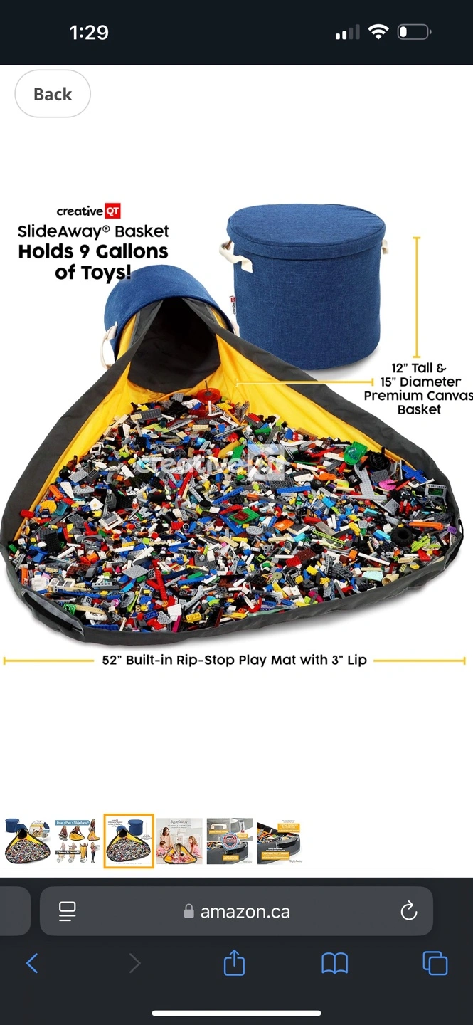 Large capacity toy storage solution. Includes a drawstring play mat and a canvas storage basket. Holds 9 gallons of toys.