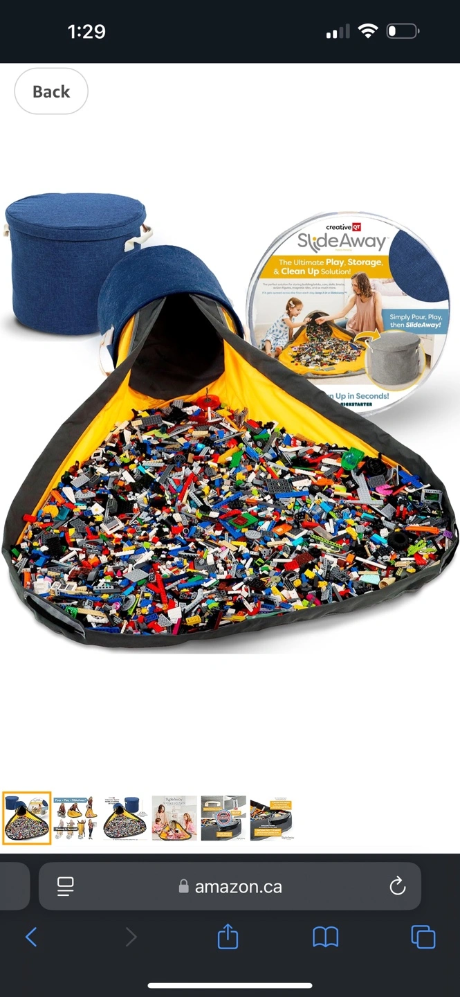 Large capacity toy storage solution. Includes a drawstring play mat and a canvas storage basket. Holds 9 gallons of toys.