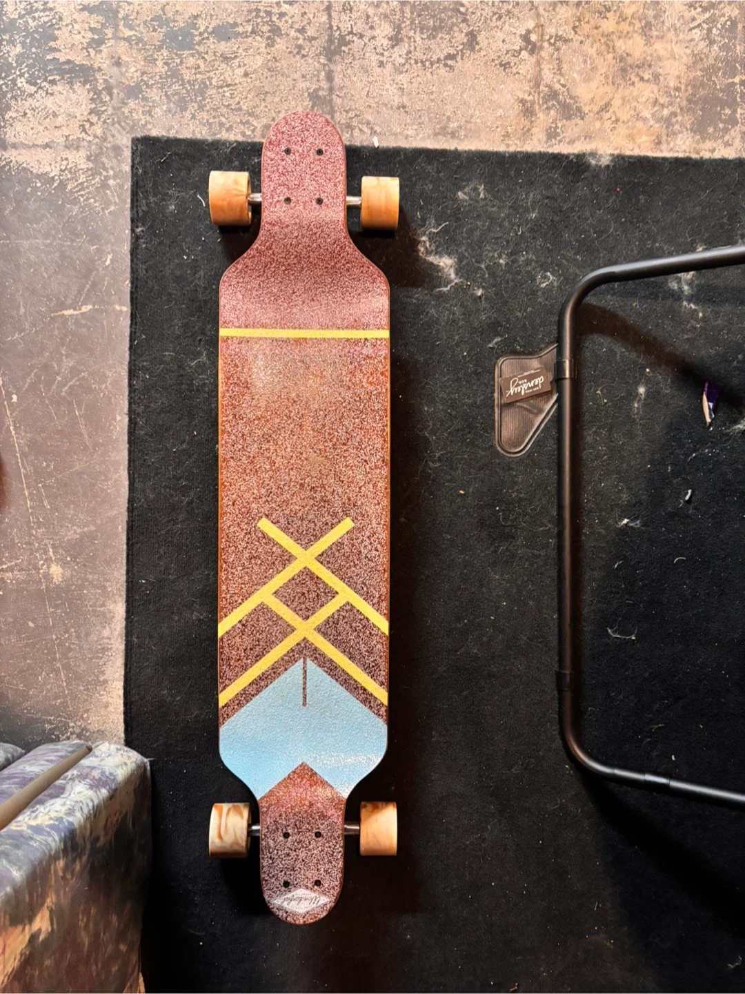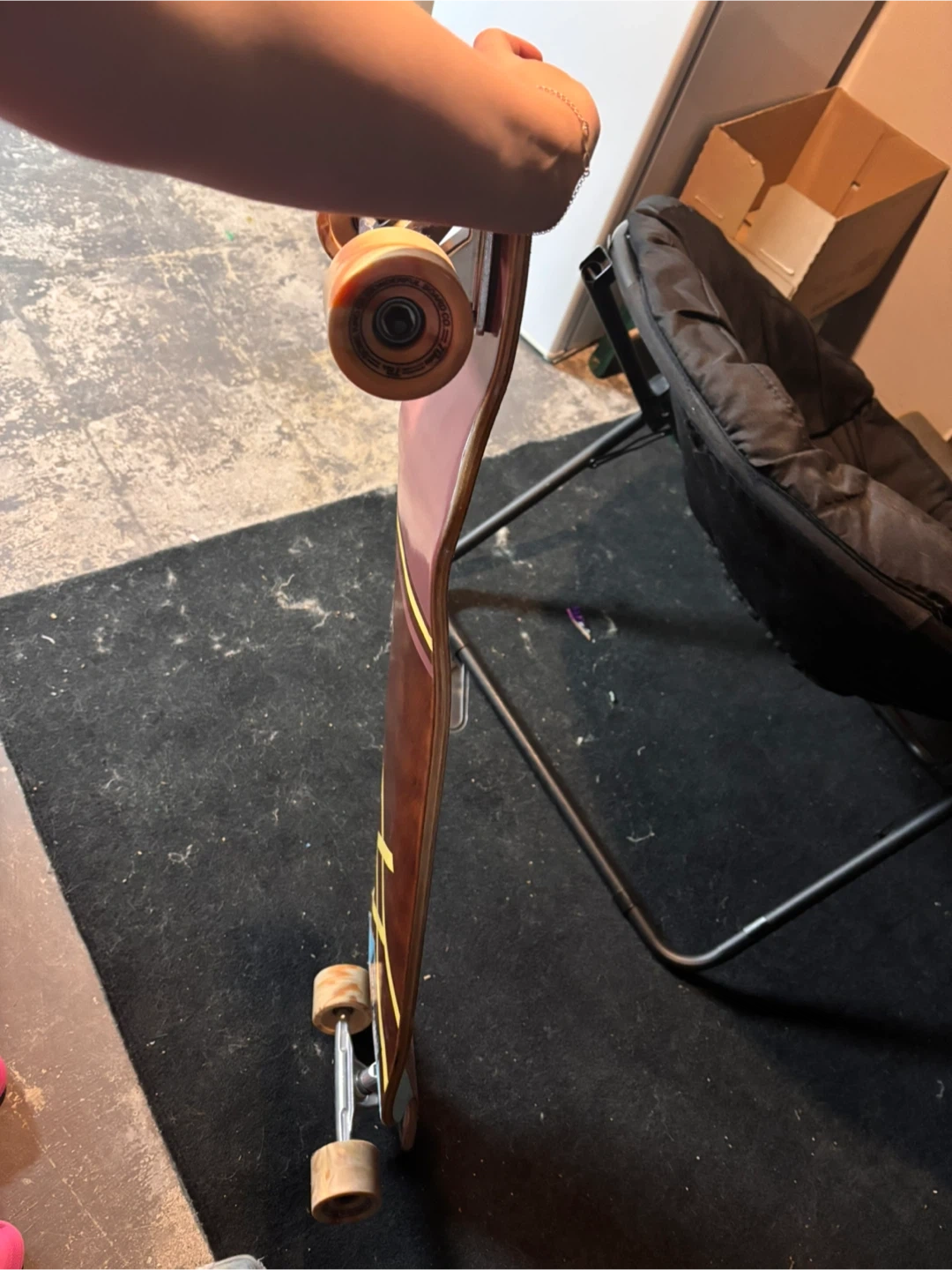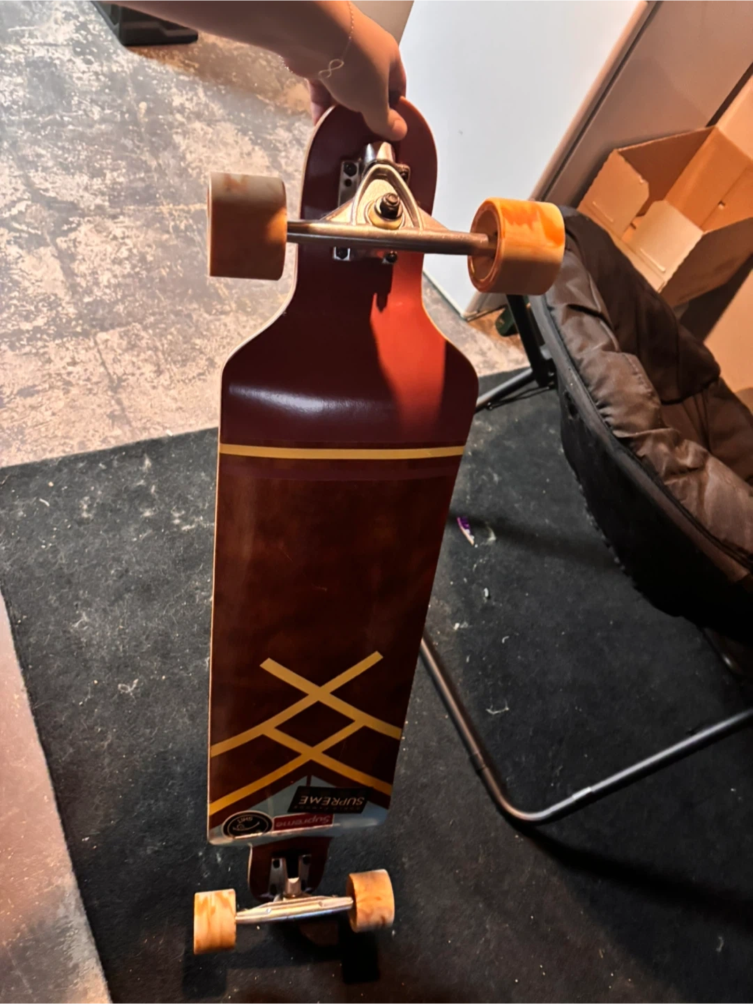 This is a Supreme longboard skateboard. It features a dark red deck with yellow stripe accents. The wheels are a light tan colour. Never been used outside. New condition