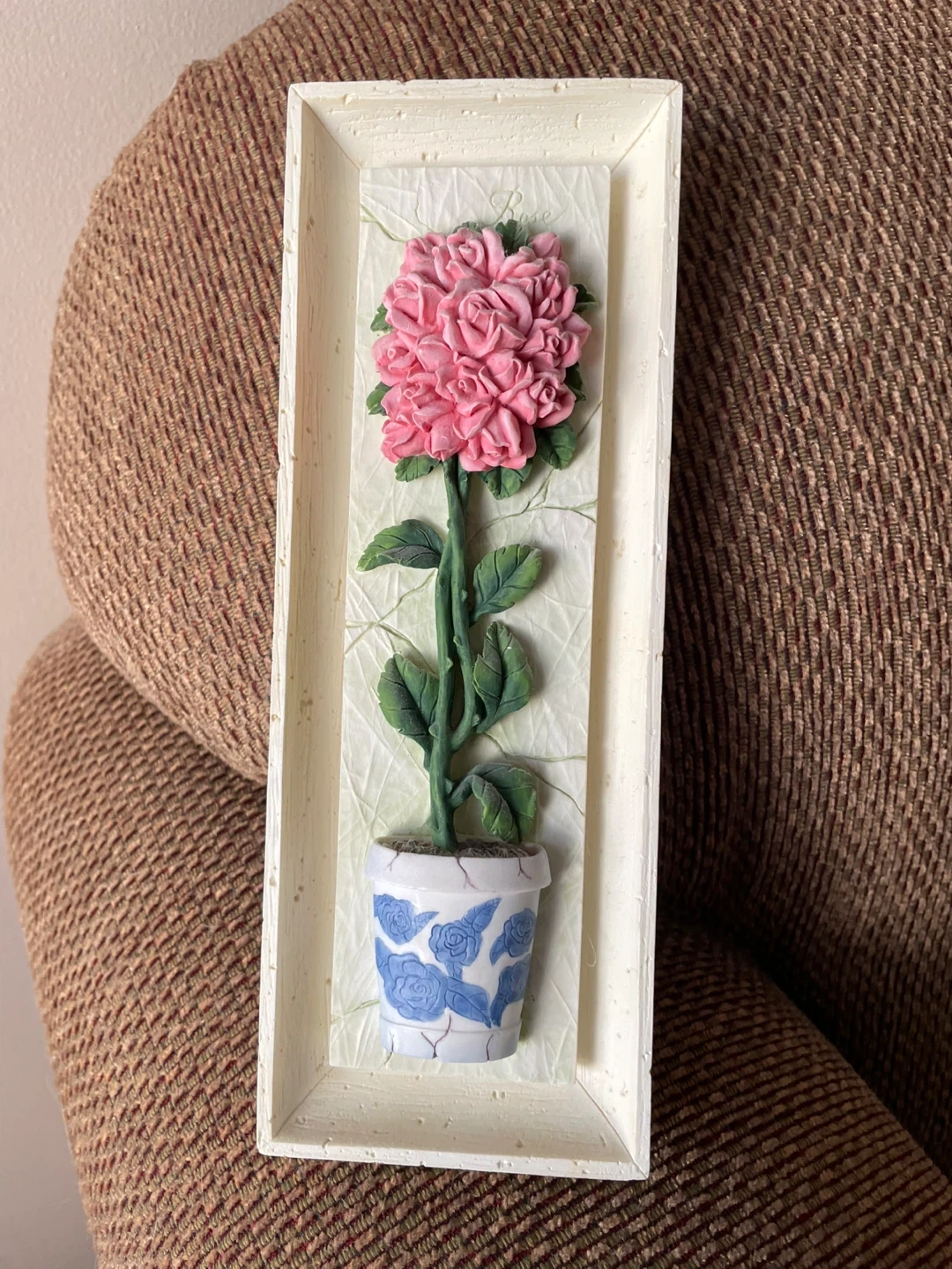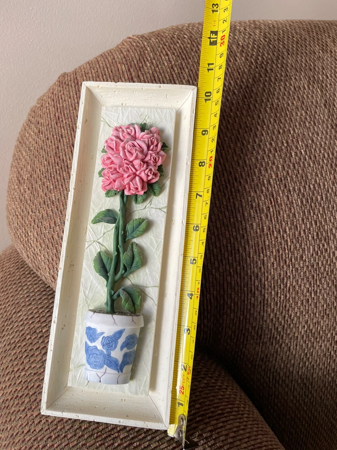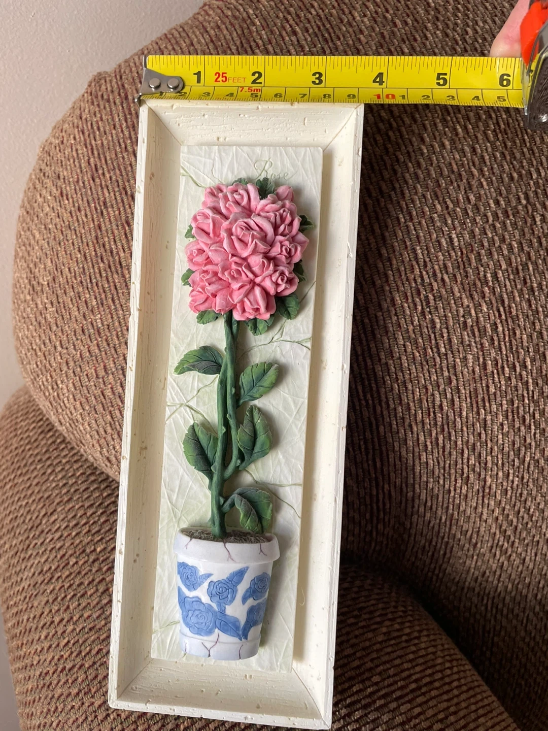 This is a decorative wall plaque featuring a pink flower in a blue and white pot. It's made of resin and has a hanging slot on the back. It measures approximately 13 inches tall and 4 inches wide.