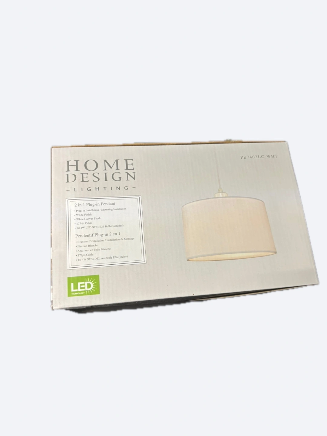 This is a Home Design Lighting 2 in 1 plug-in pendant. It features a white cotton shade and includes a 12W LED E26 bulb. The cord is 197 inches long. It's designed for plug-in installation or mounting.
