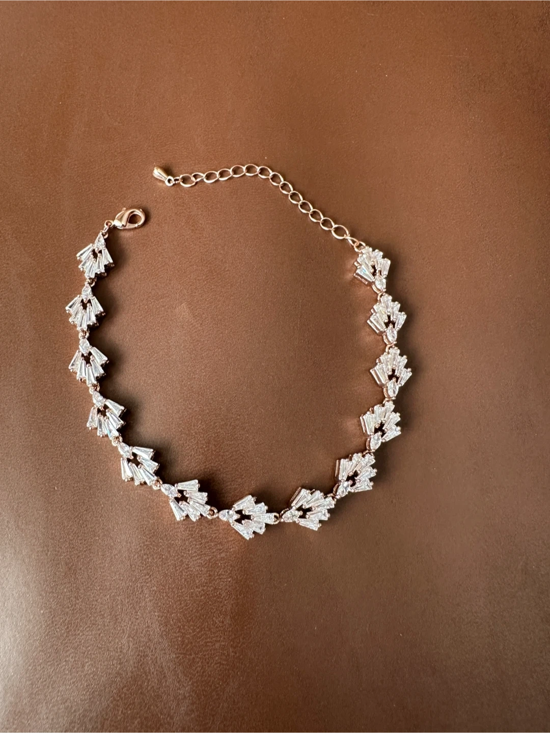 A delicate rose gold-toned tennis bracelet featuring baguette-cut cubic zirconia stones. It's adjustable with a lobster clasp closure. This bracelet catches the light beautifully!