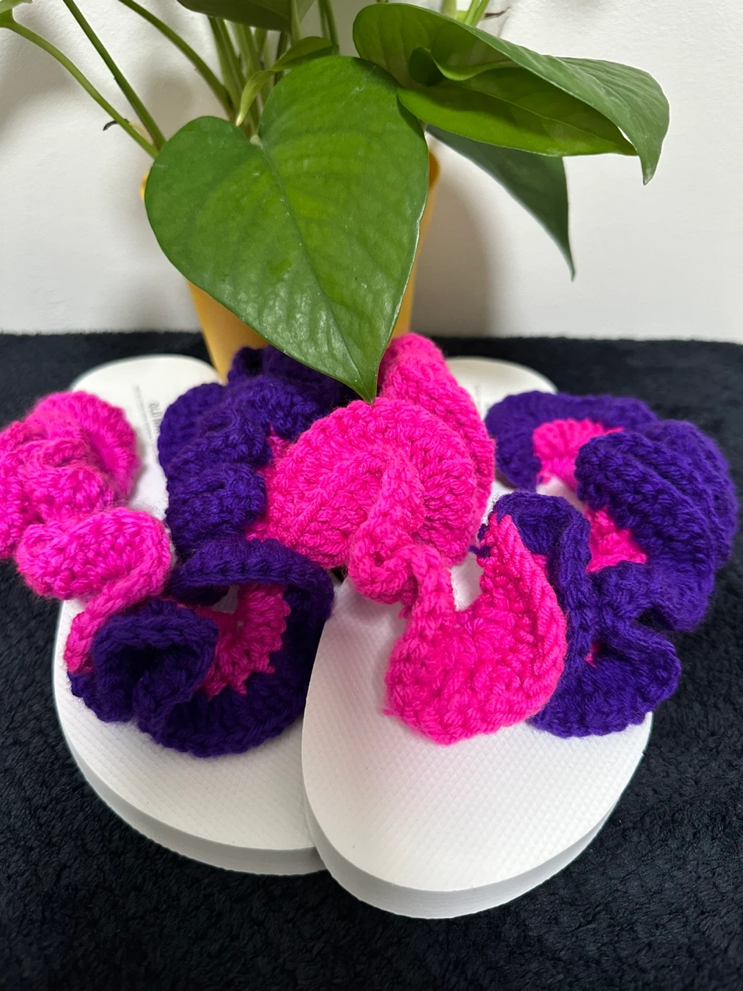 These are some cute handmade crochet flip flops! They feature a fun and vibrant pink and purple design. Perfect for adding a pop of color to your summer outfits