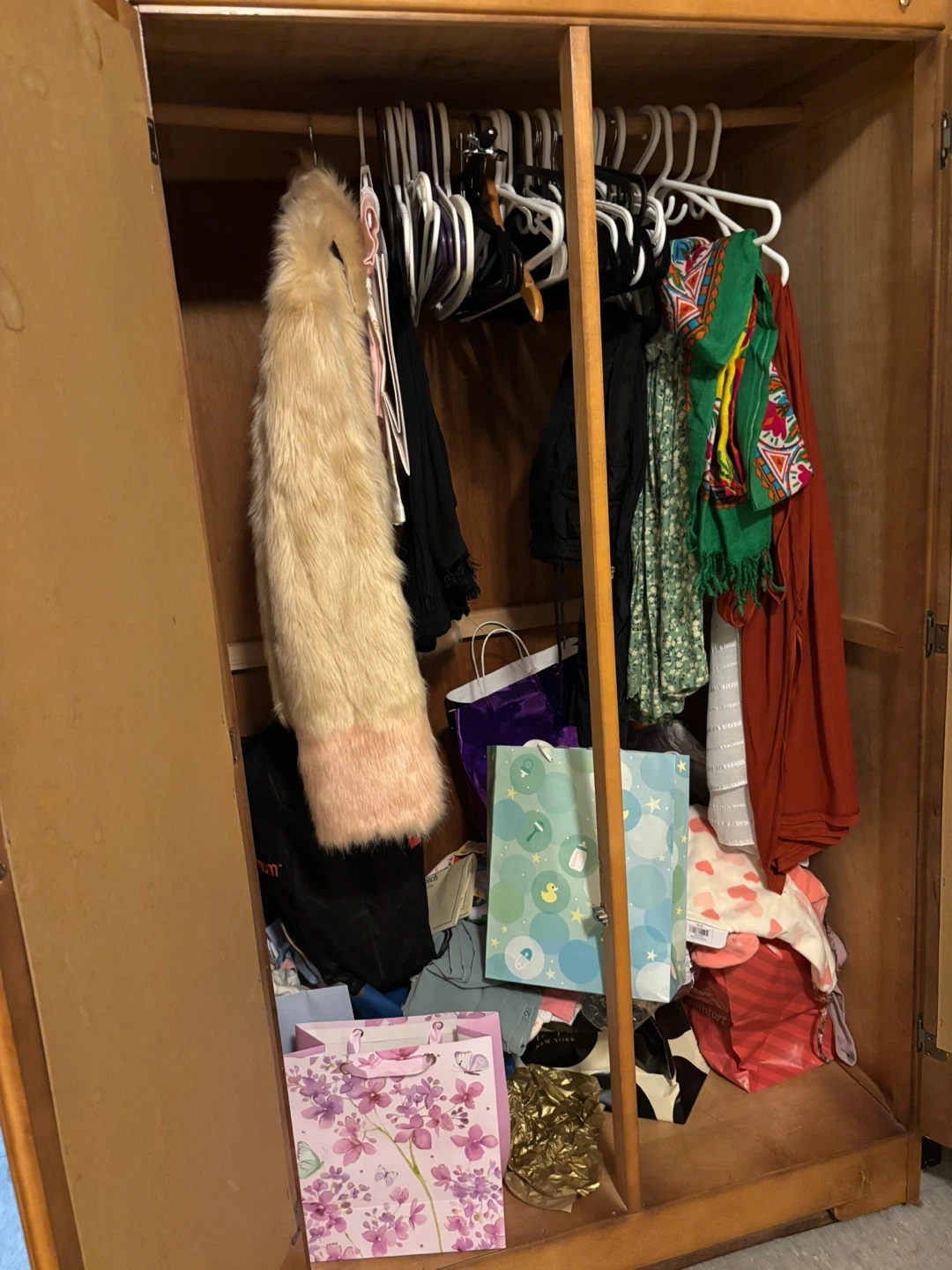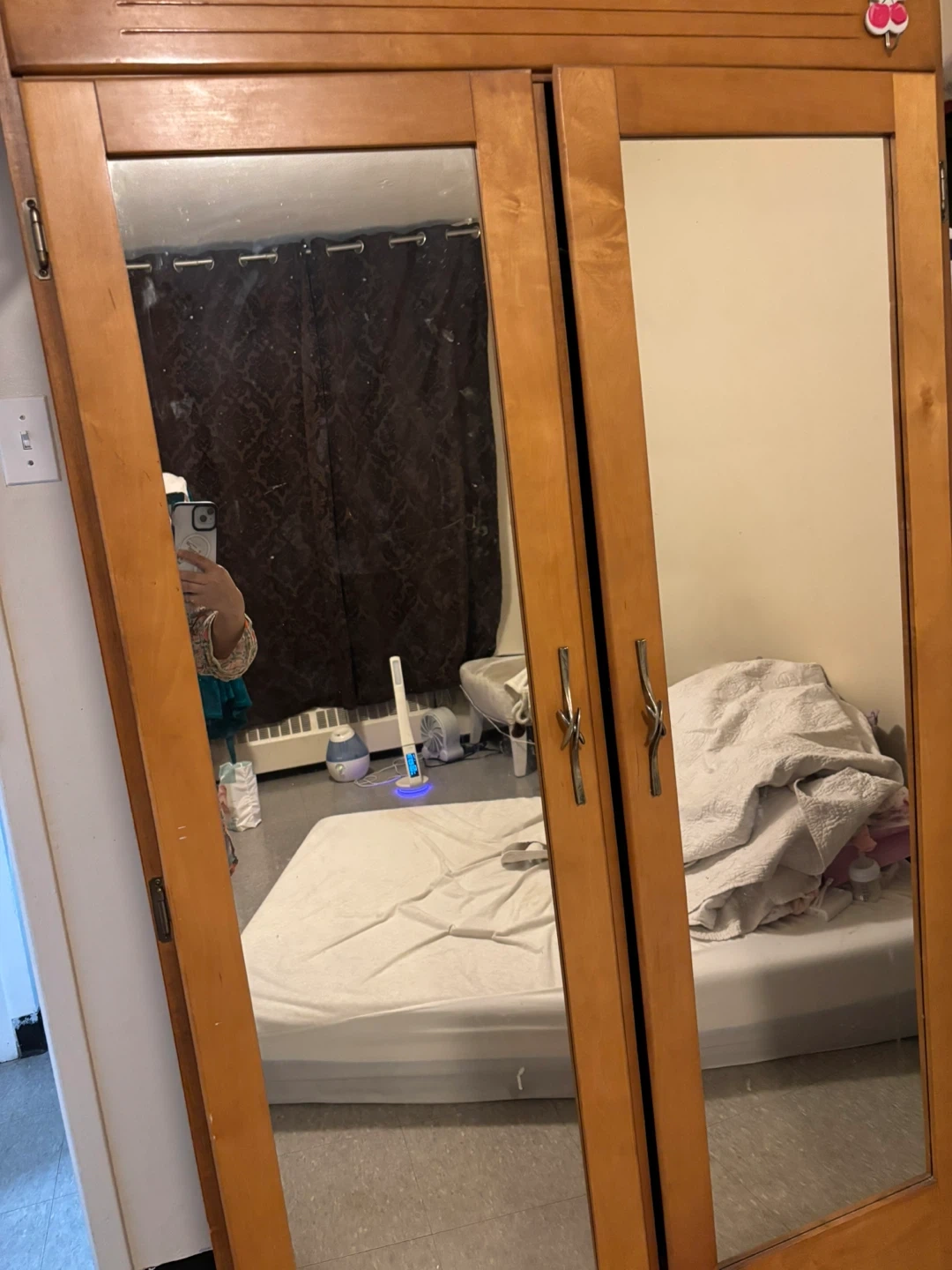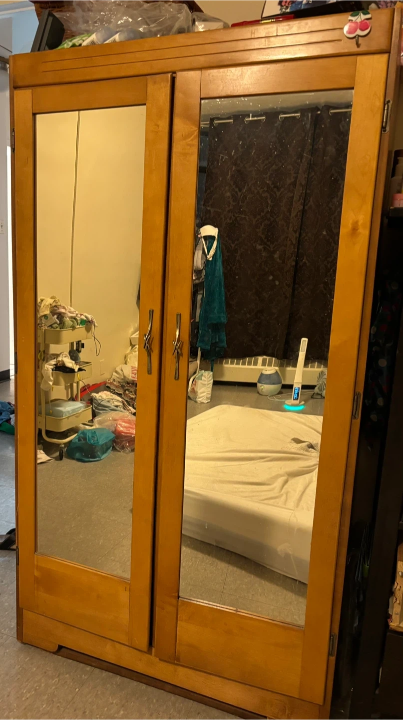 This is a stylish antique wooden armoire with two mirrored doors. It's got a good amount of storage space inside. The wood is a warm, light tone. It comes with a hanging rods and alot of storage space. very unique and beautiful, selling bcz moving out.
