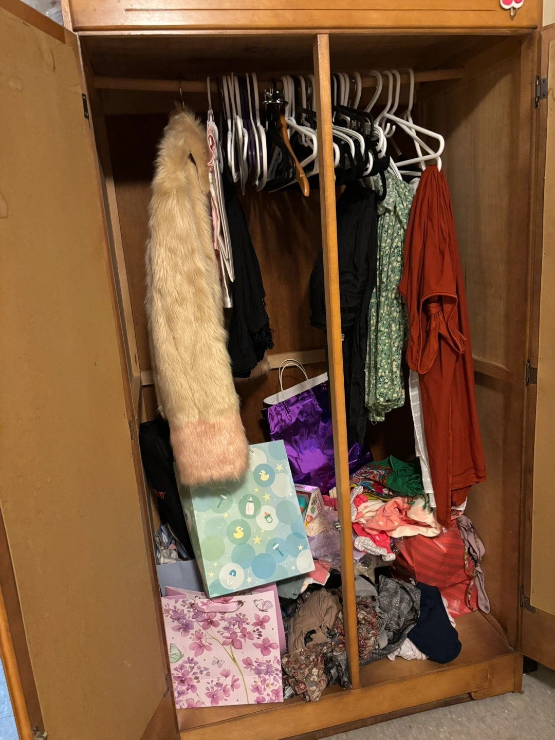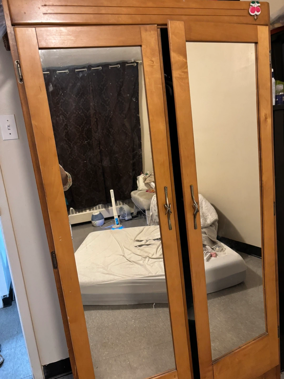 This is a stylish antique wooden armoire with two mirrored doors. It's got a good amount of storage space inside. The wood is a warm, light tone. It comes with a hanging rods and alot of storage space. very unique and beautiful, selling bcz moving out.
