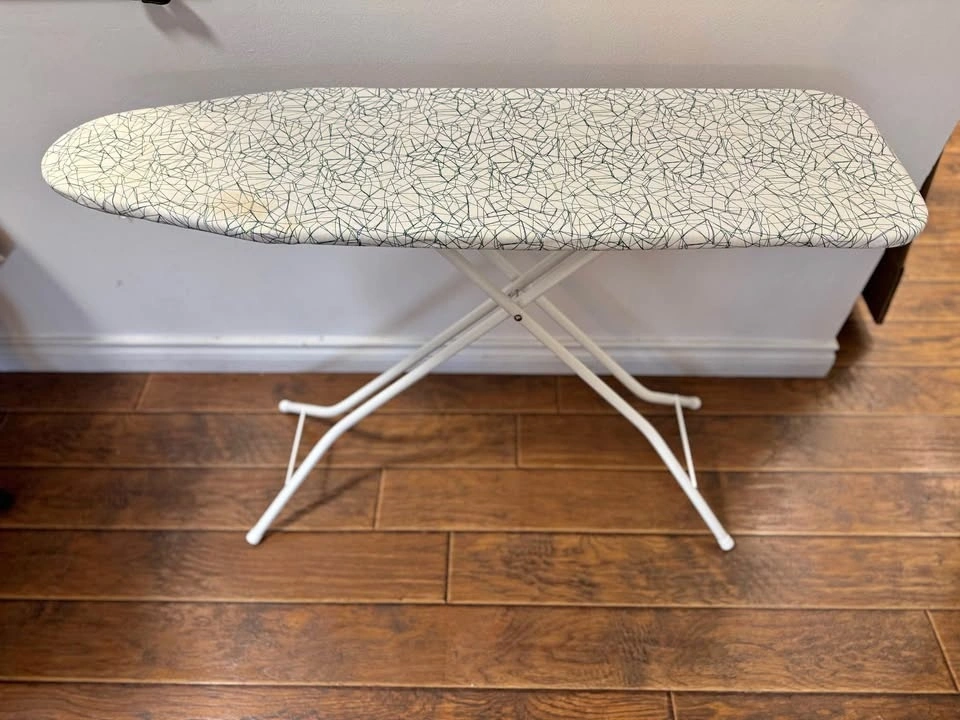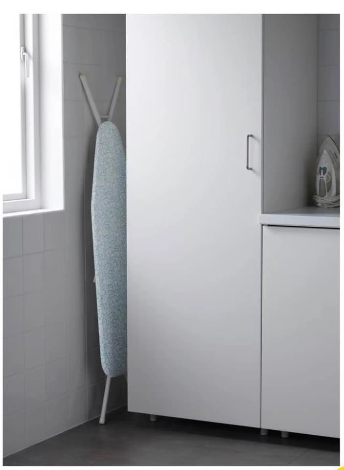 Good condition IKEA ironing board with a sturdy white metal frame and patterned cover.