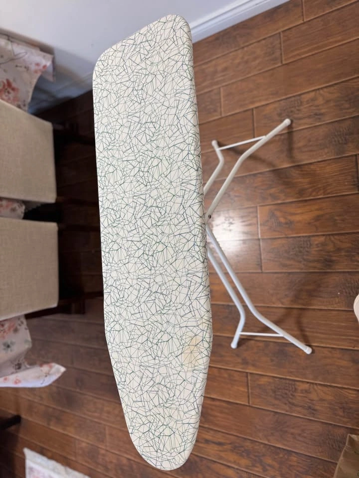 Good condition IKEA ironing board with a sturdy white metal frame and patterned cover.