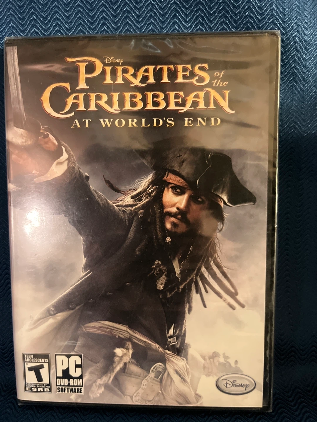 This PC game is Pirates of the Caribbean: At World's End. It requires a DVD-ROM drive to play. This game is rated T for Teen.