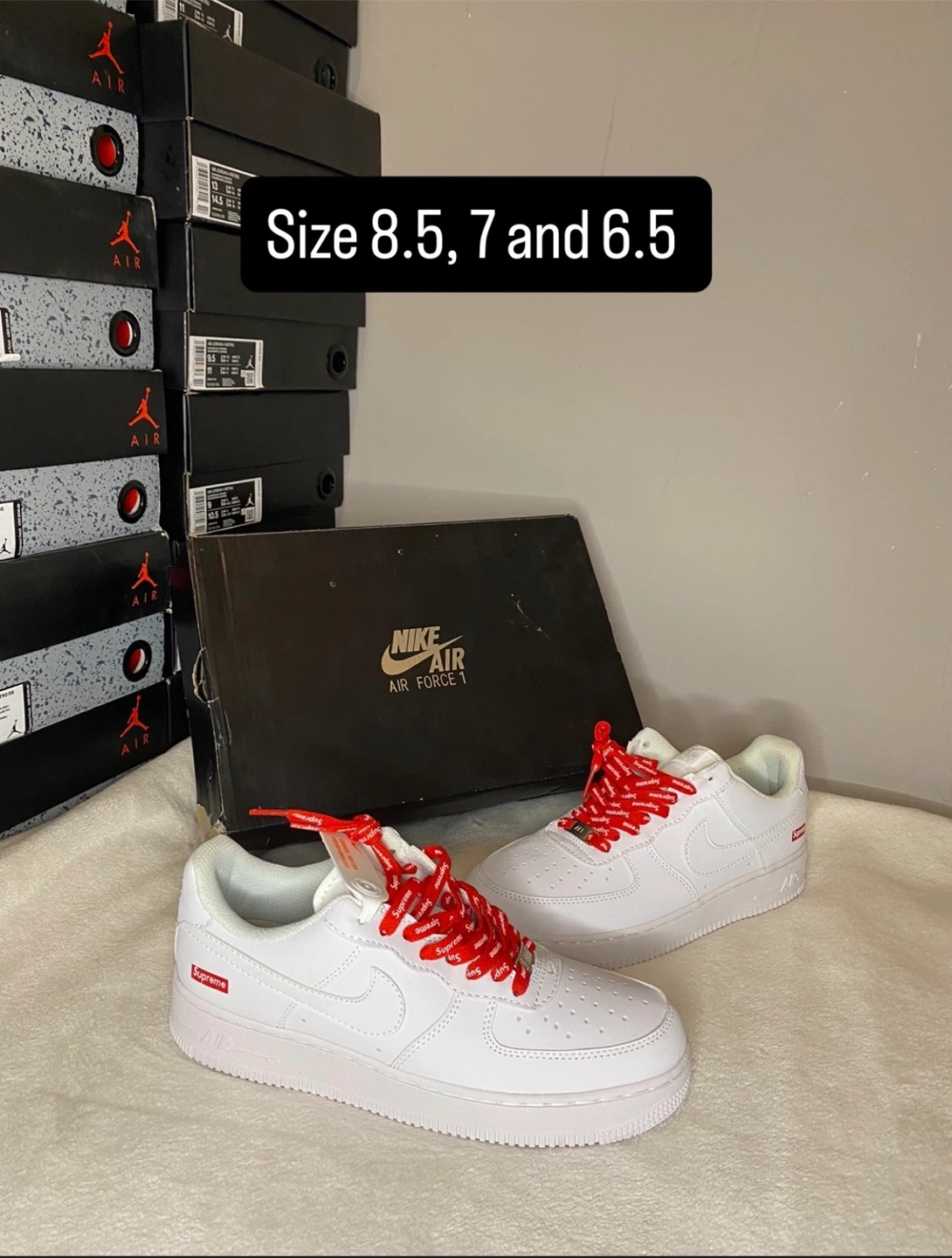 These are Nike Air Force 1 Low sneakers with Supreme branding. Available in sizes 8.5, 7, and 6.5. Includes original box.