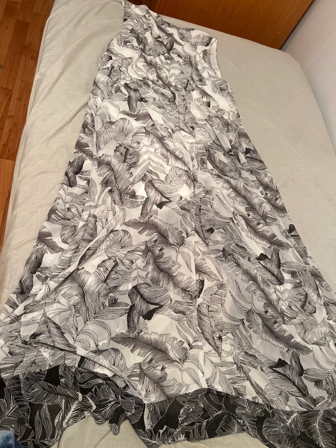 This is a Cielo maxi dress in size small. It features a beautiful black and white leaf print. It's perfect for summer!