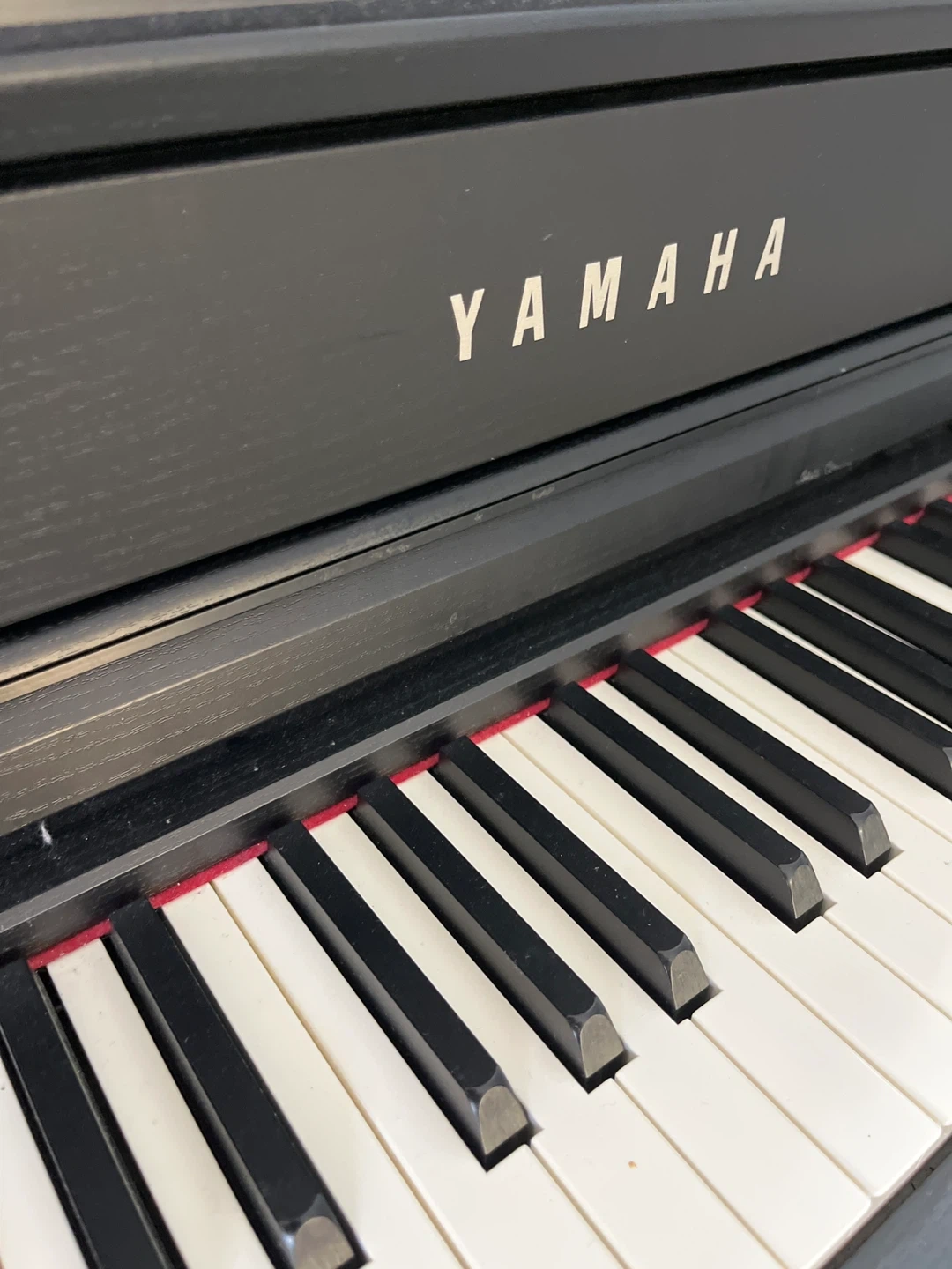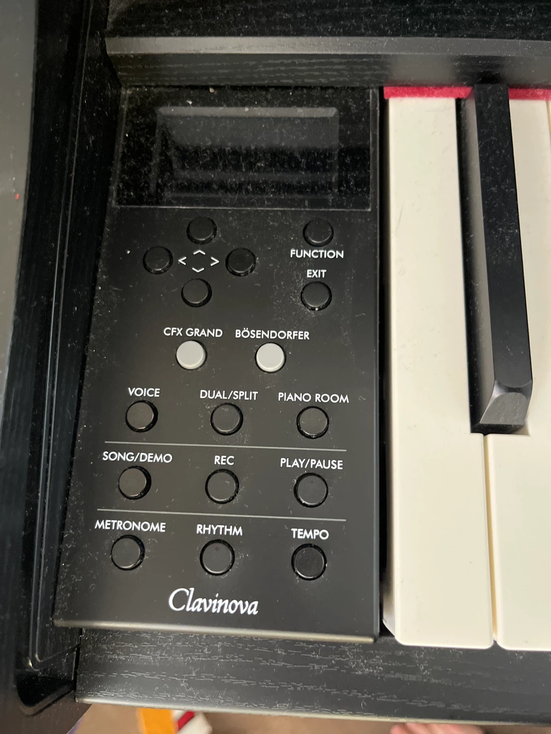 Yamaha Clavinova CLP-735 digital piano. Features CFX Grand and Bösendorfer voices, dual/split modes, and a metronome. Master volume control is present. It has recording capabilities and song demonstration functions.