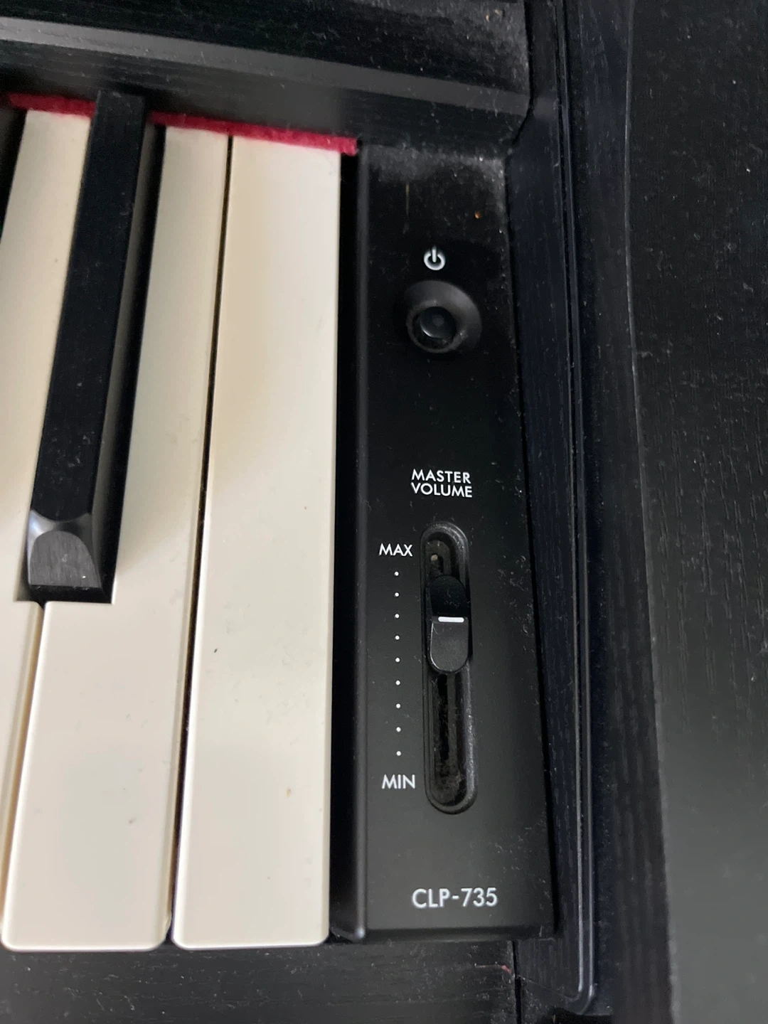 Yamaha Clavinova CLP-735 digital piano. Features CFX Grand and Bösendorfer voices, dual/split modes, and a metronome. Master volume control is present. It has recording capabilities and song demonstration functions.