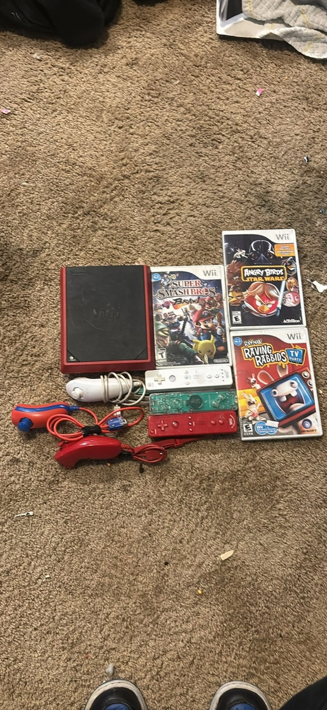 This is a used Red Nintendo Wii mini console bundle, perfect for gamers who love classic Wii titles! The set includes the console, three remotes, three nunchuks, and three games: Super Smash Bros Brawl, Angry Birds Star Wars, and Raving Rabbids. Cash only