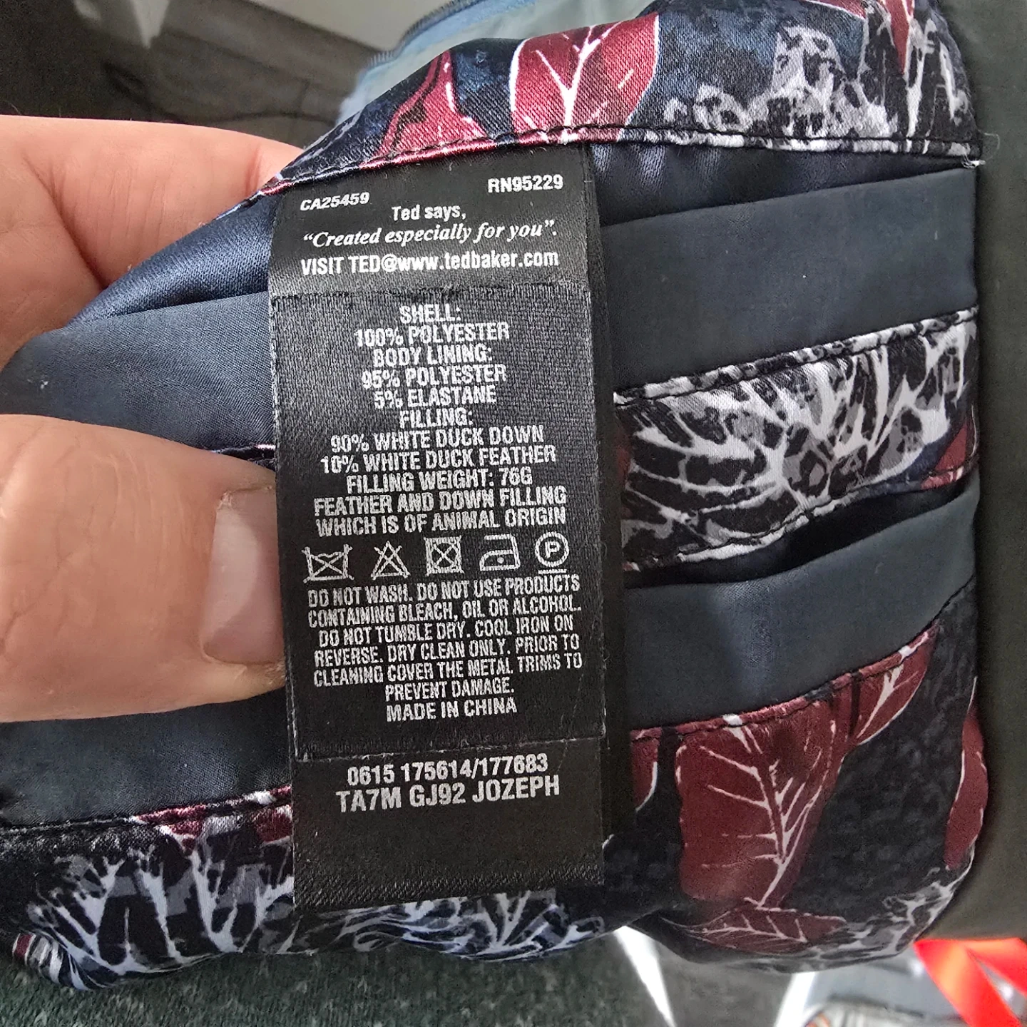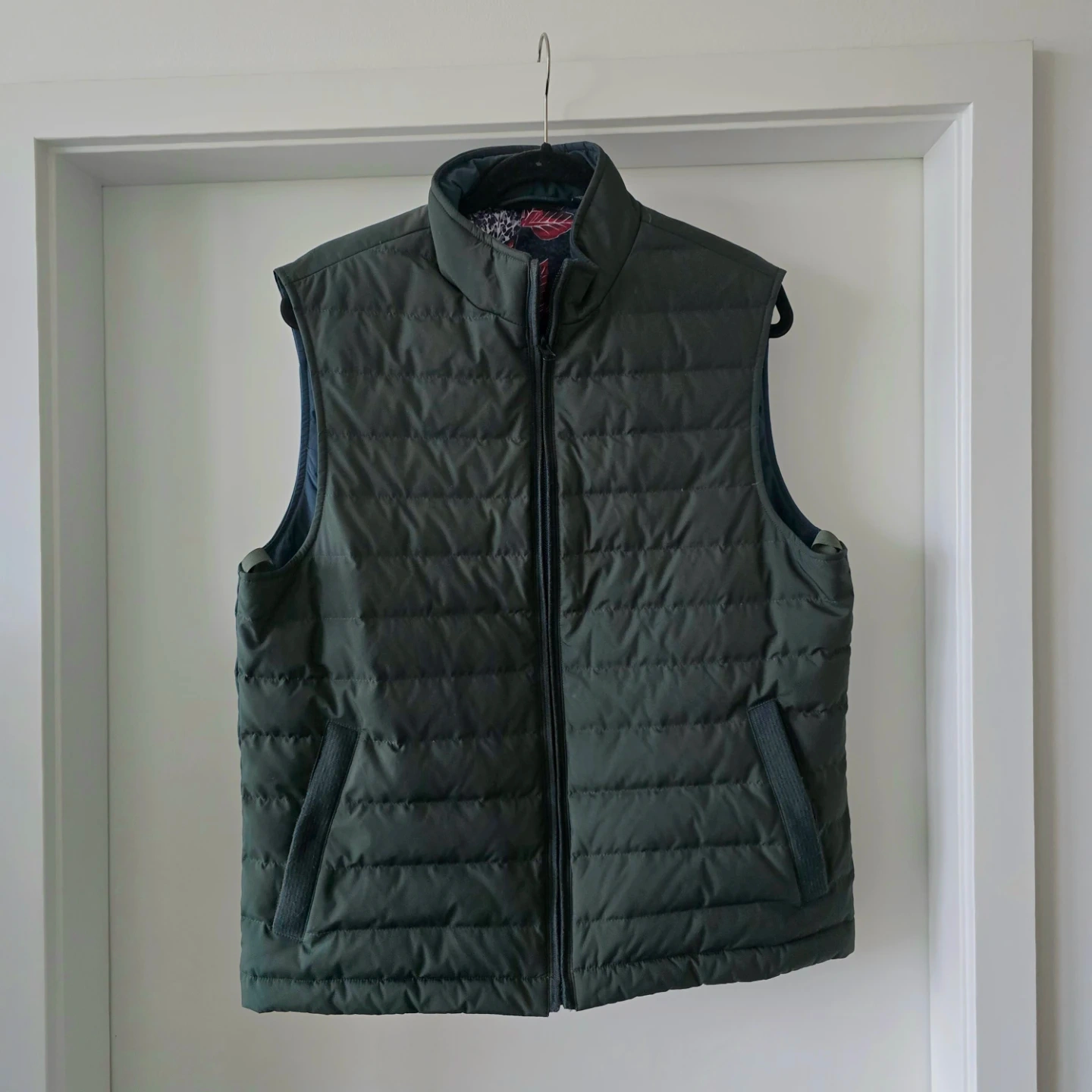 Practically brand new, worn twice. Ted Baker London vest in size 4, duck down filled. Stylish leaf-patterned interior, forest green exterior. Stylish and quality. Sells for $300 new. Pick up in Brentwood.