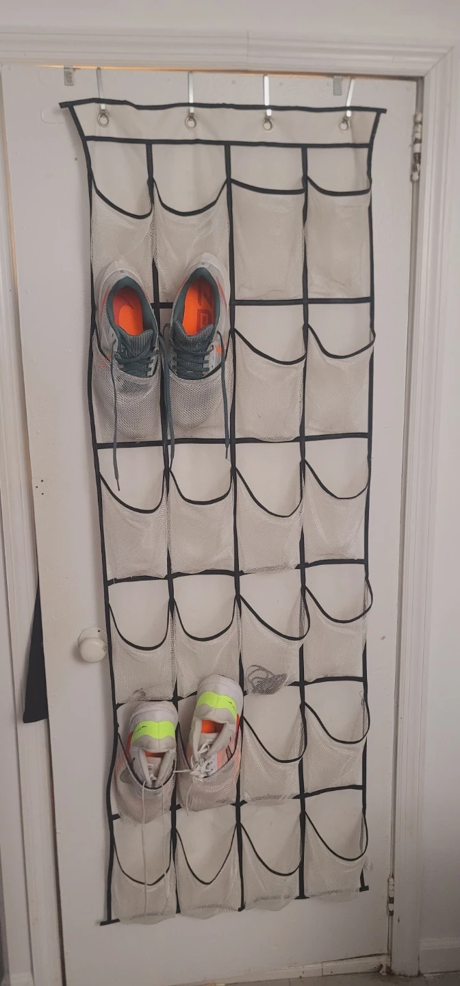 This over-the-door organizer has 24 mesh pockets for shoes or other items. It hangs using metal hooks on top. Great for decluttering entryways or closets!