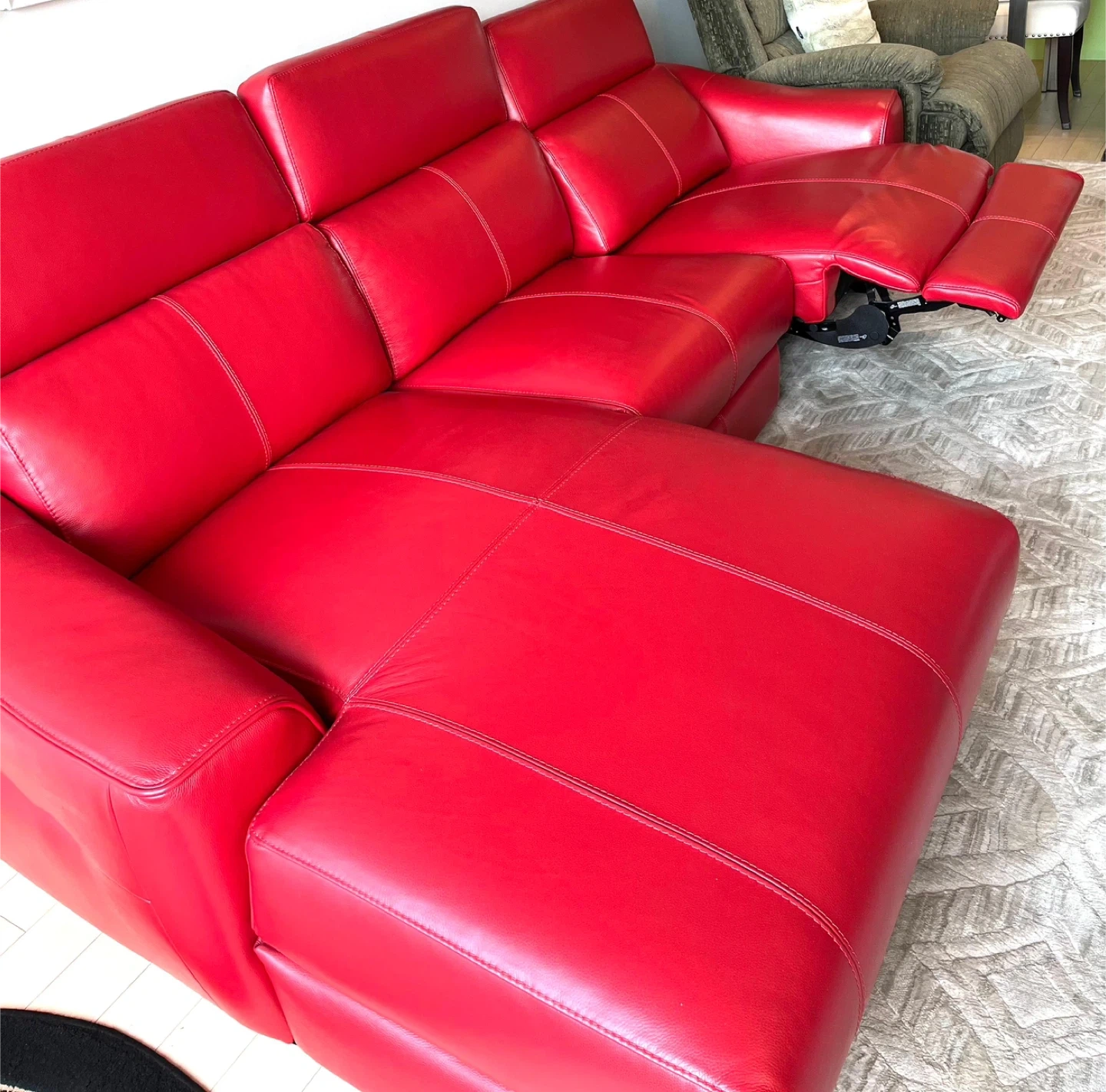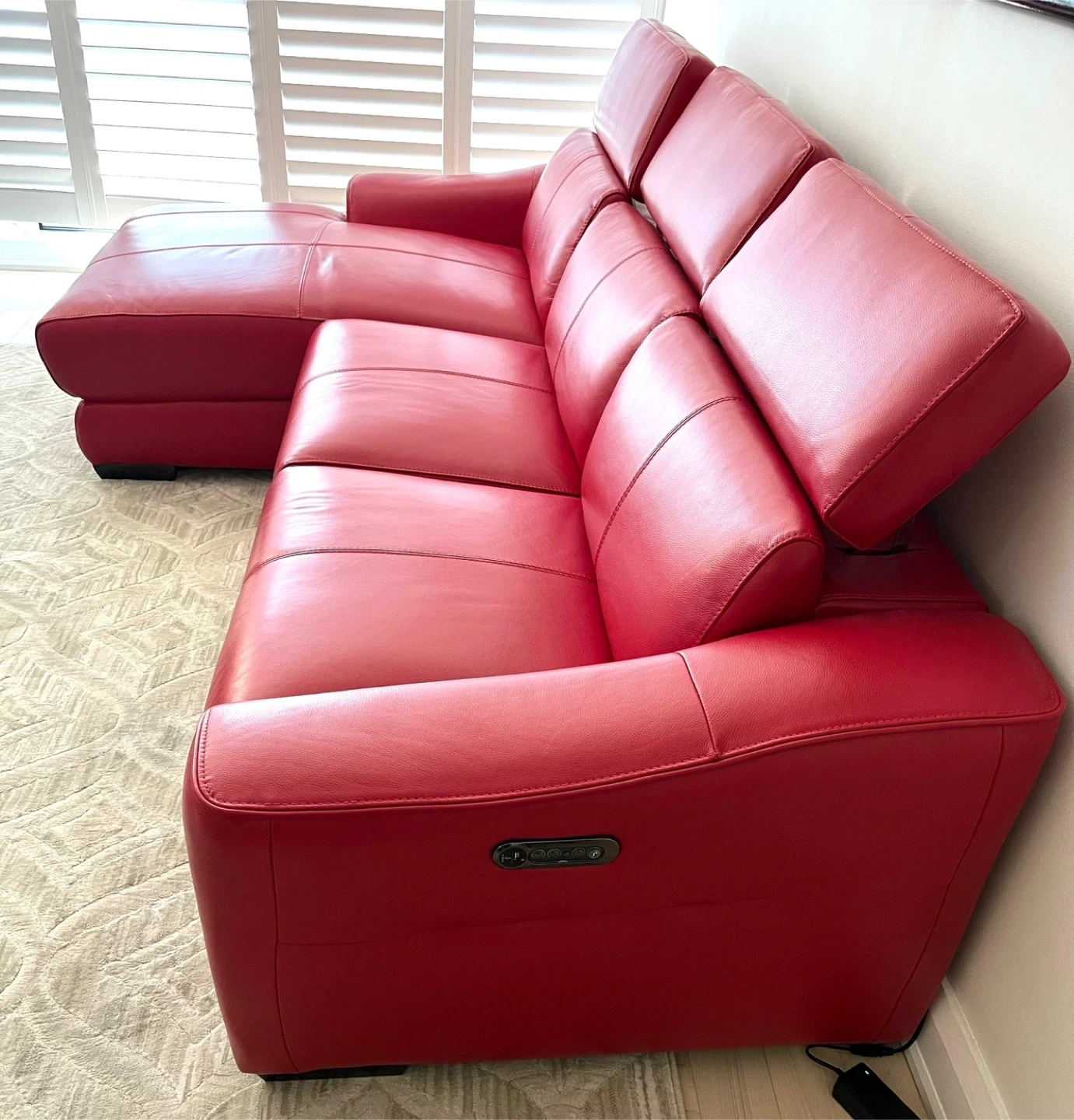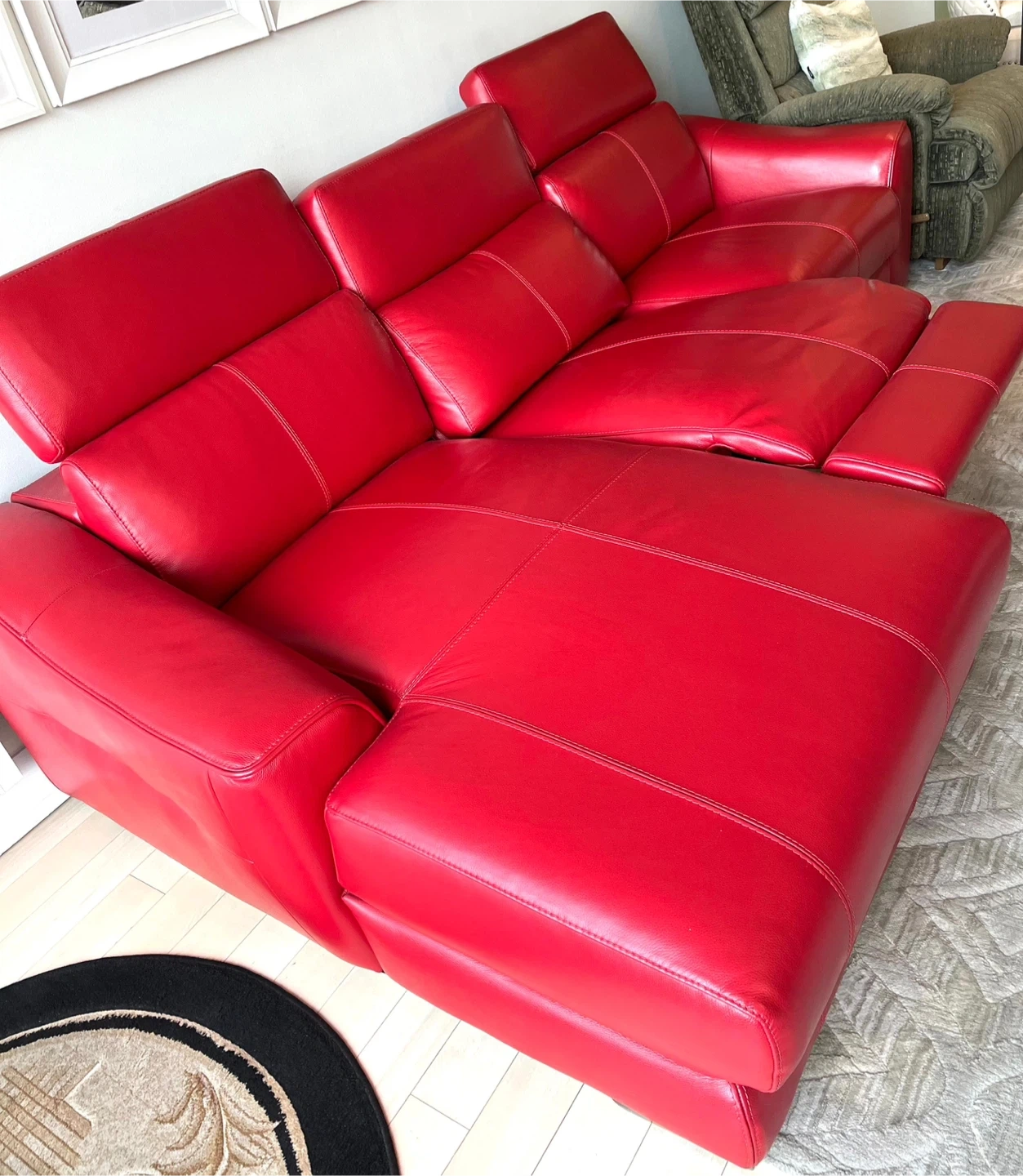 Selling a vibrant red leather sectional sofa! Was imported from Germany , genuine leather . It features reclining seats for ultimate relaxation. The sofa appears to be in great condition and would be a stylish addition to any living room