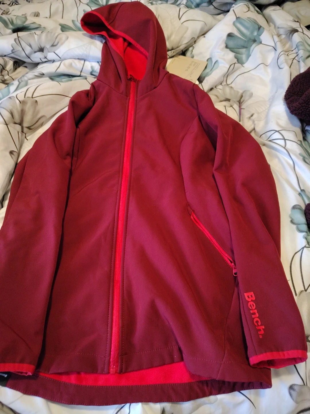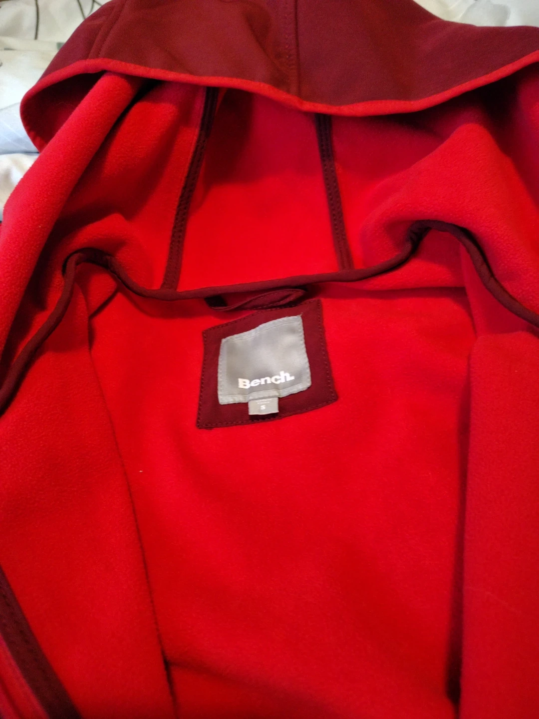 A maroon Bench hooded jacket with a red zipper. It's size S and made of softshell material. It has two zip pockets on the front.pictures do not do it justice coat is hardly worn great spring/fall jacket