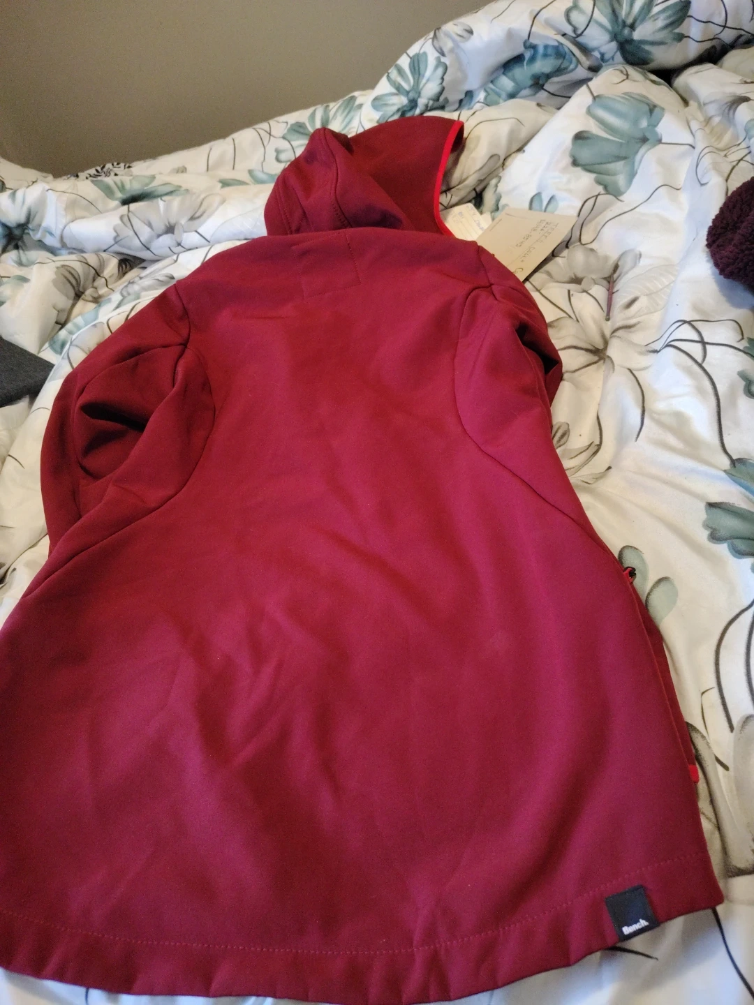A maroon Bench hooded jacket with a red zipper. It's size S and made of softshell material. It has two zip pockets on the front.pictures do not do it justice coat is hardly worn great spring/fall jacket