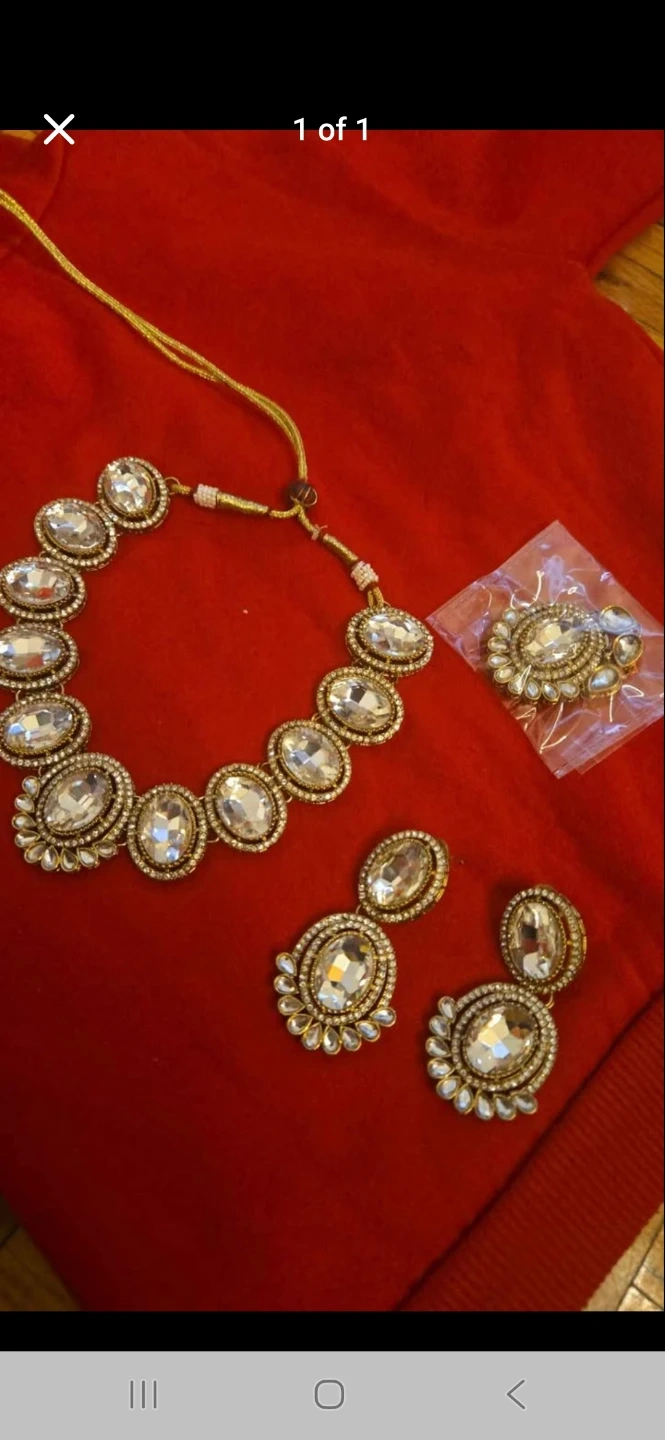 This is a beautiful gold-tone necklace and earring set. It features clear oval-shaped jewels surrounded by smaller accents. The necklace has an adjustable drawstring closure. A matching pendant is also included, still in its original plastic packaging.