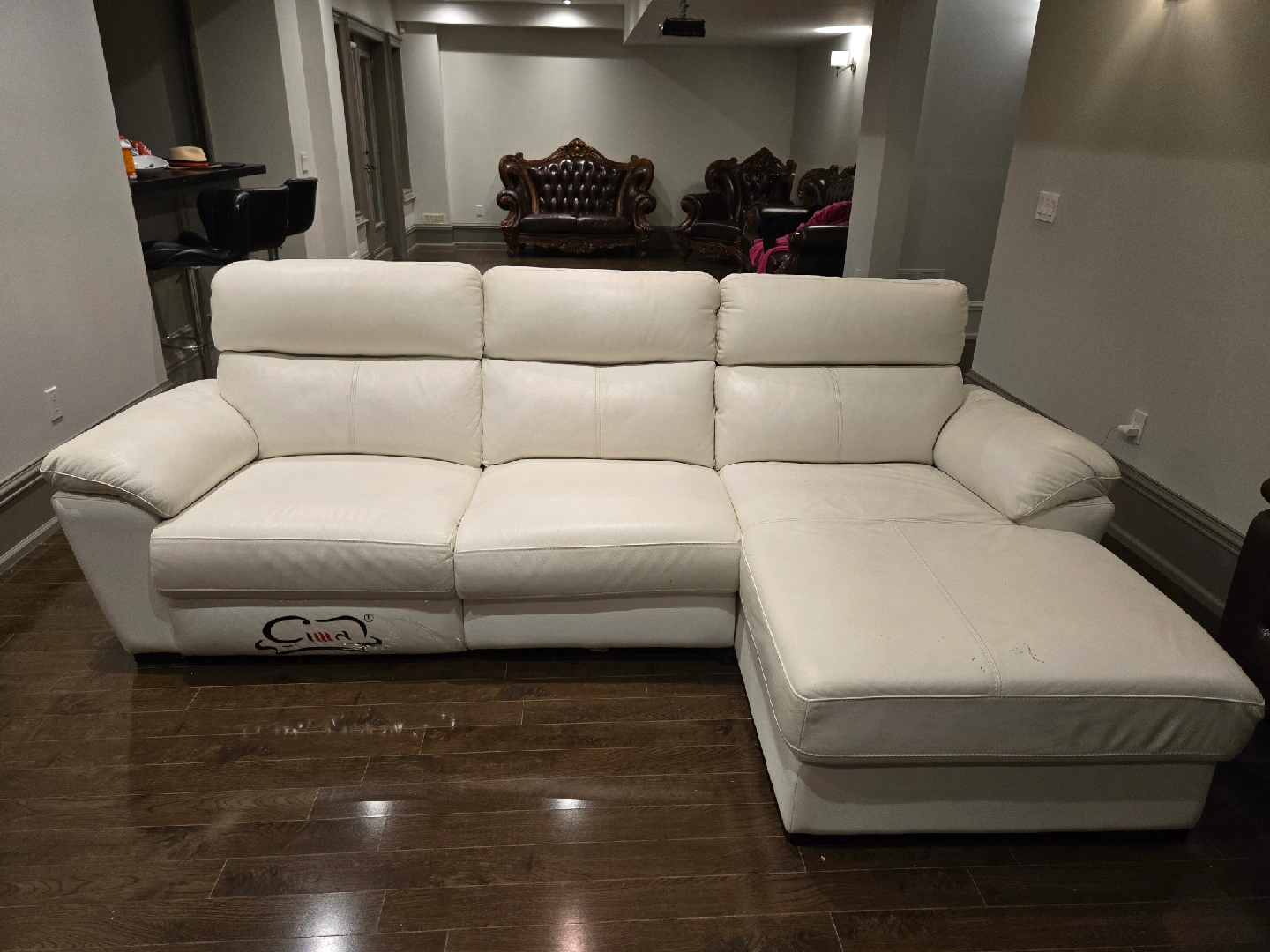 Selling a Cima white leather sectional sofa. It's in good condition and would be a great addition to any living room. The sofa features a chaise lounge for extra comfort and relaxation. It's perfect for lounging and watching movies with the family!