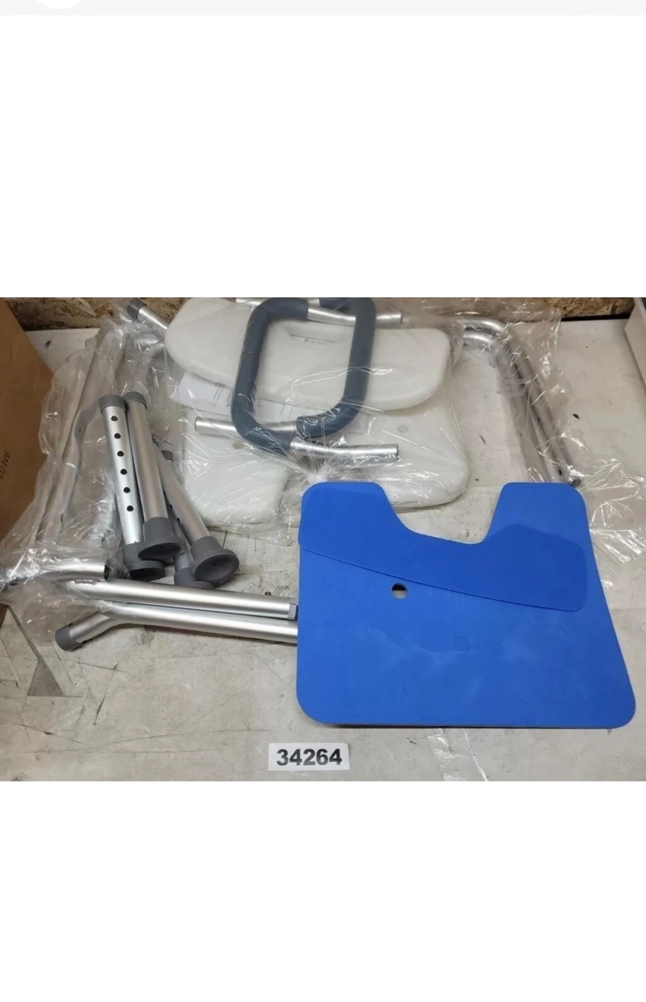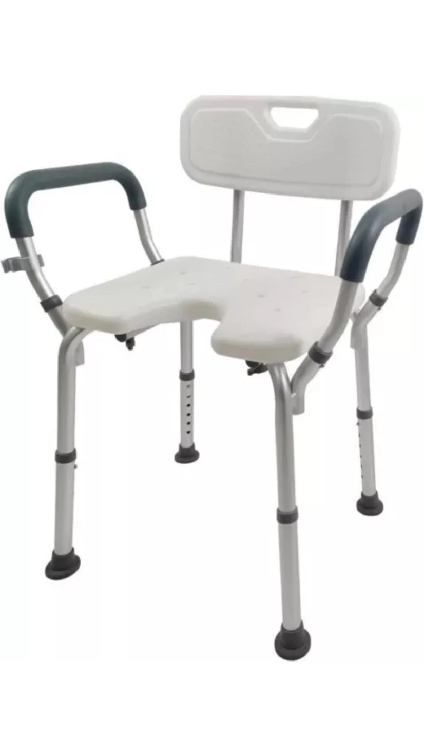 Lightweight and adjustable shower chair. Features backrest and armrests. Ideal for seniors or those with mobility issues. Easy to assemble and clean. Includes extra blue cushion.