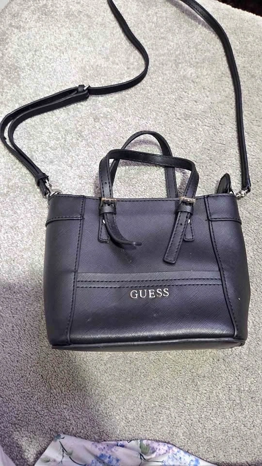 Stylish black GUESS crossbody bag with a textured faux leather finish. Features dual top handles and an adjustable long shoulder strap. Barely worn. Pickup at Don Mills and Eglinton.