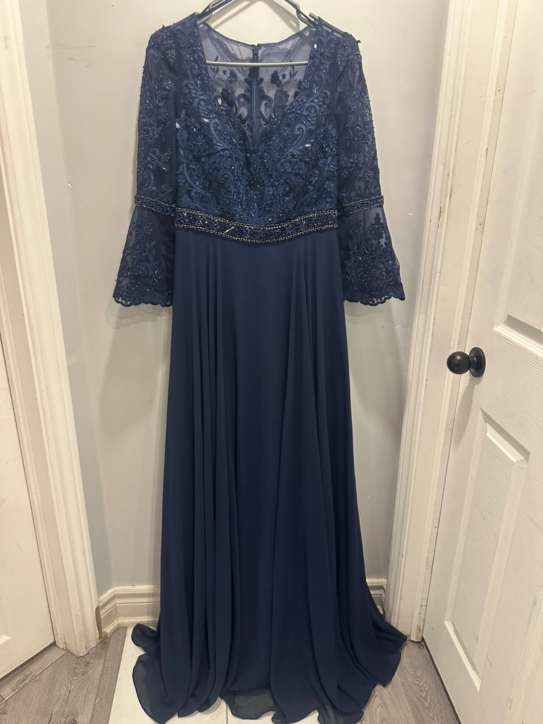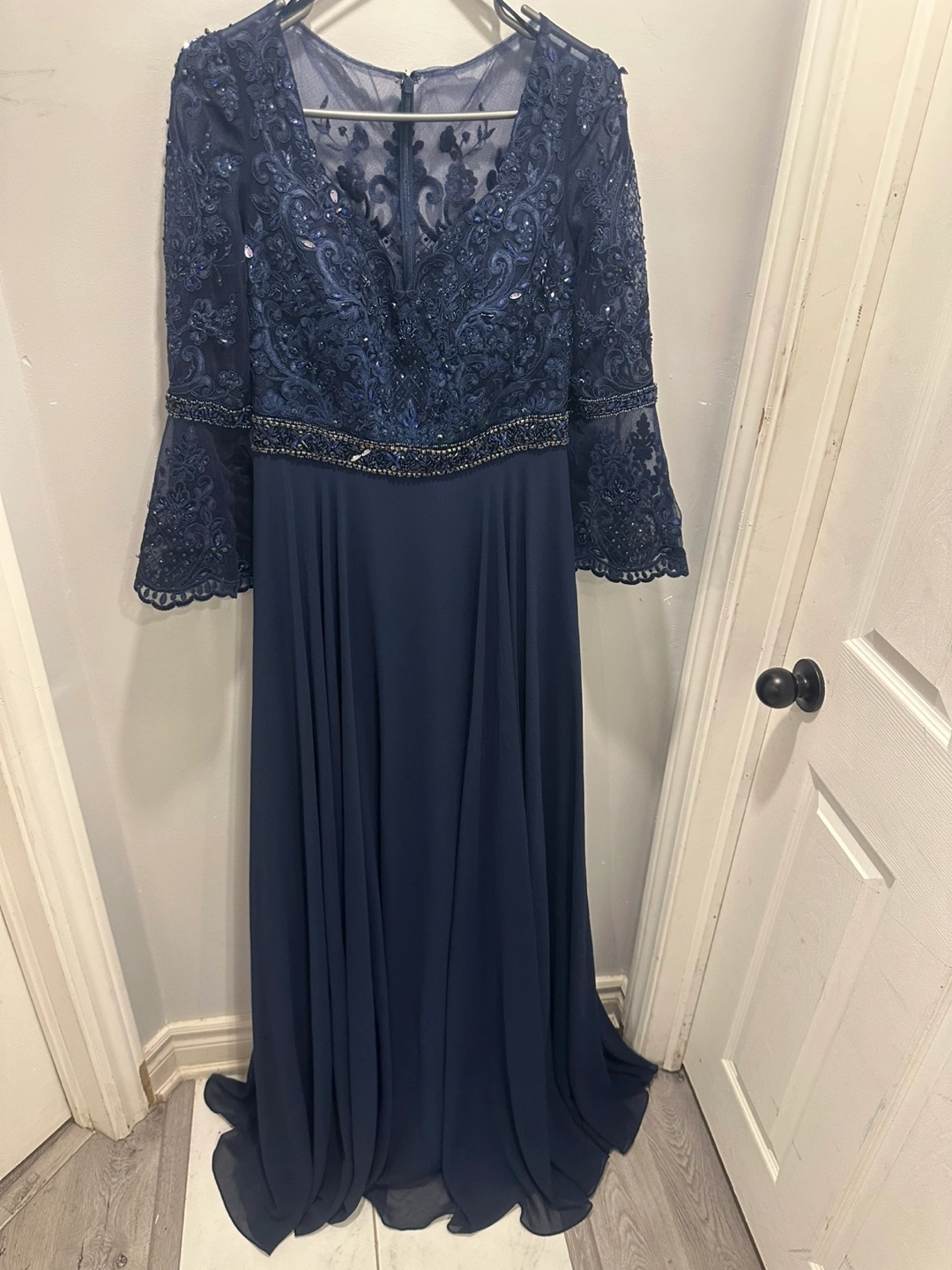 A beautiful evening gown in a dark blue colour. The top features detailed lace and beading, with long sleeves. Below the waist, the dress flows gracefully. Just imagine yourself wearing this dress and feeling elegant and comfortable all night long.