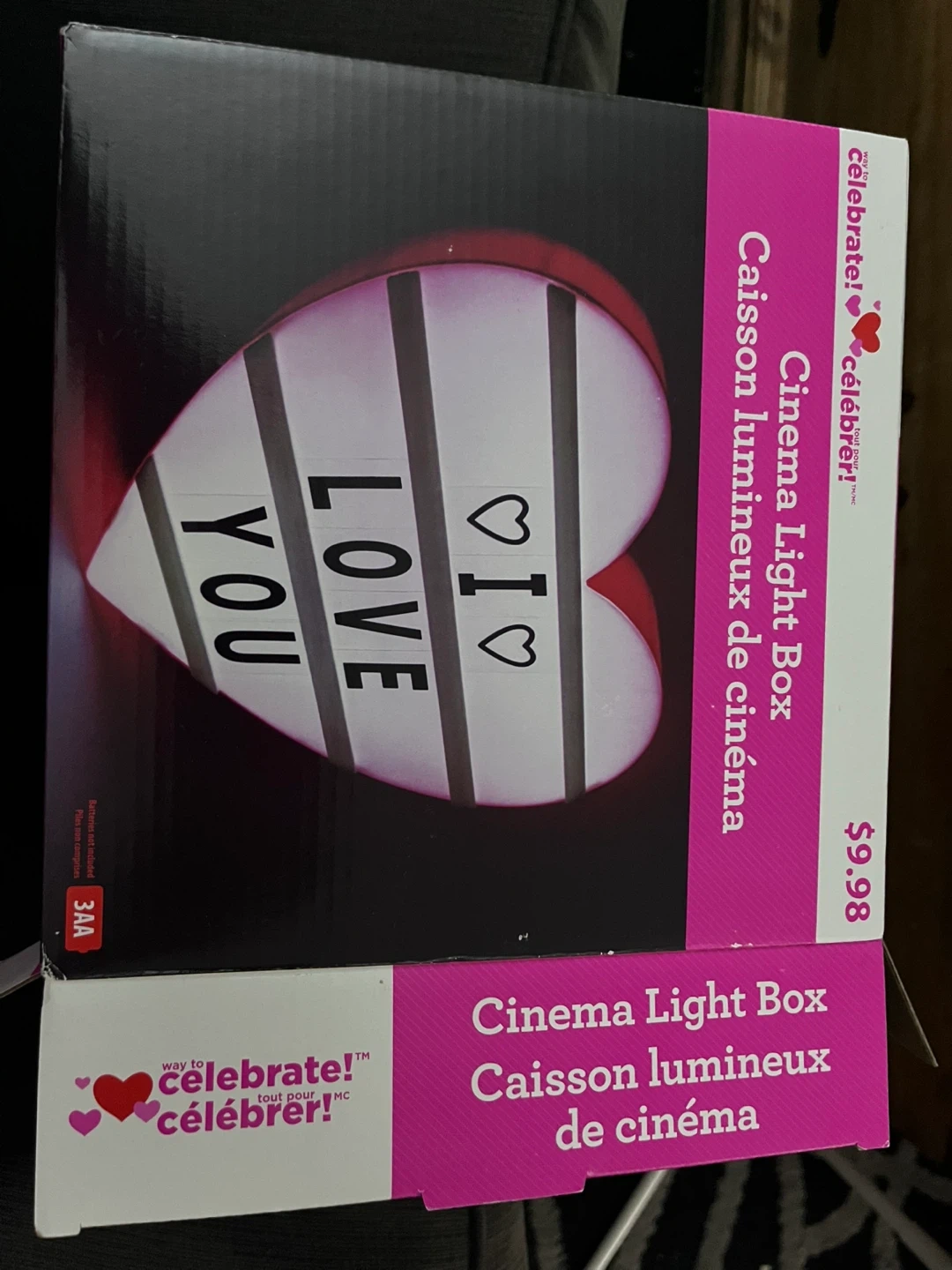 119Selling a cute heart-shaped Cinema Light Box from Celebrate! This will make a great Christmas gift as it is in the original packaging. It requires 3 AA batteries (it does not come with it) 9” x 9” x 2” thick It comes with: - Letter and symbol tiles Originally bought for $9.98 selling for $5. If the ad is up then it’s still available.