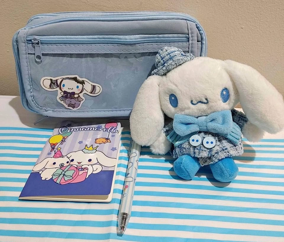 25Cinnamoroll mini gift set: - one pencil case with pin and transparent area for decorations such as cards or stickers - multiple zippers and layers for organization and storage - including a mini notebook and pen One Cinnamoroll Plushie Thanks! Pick up at killarney community center 6260 Killarney St, Vancouver, BC V5S 2X7