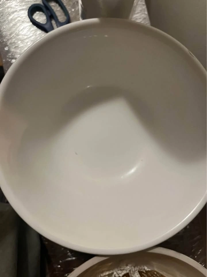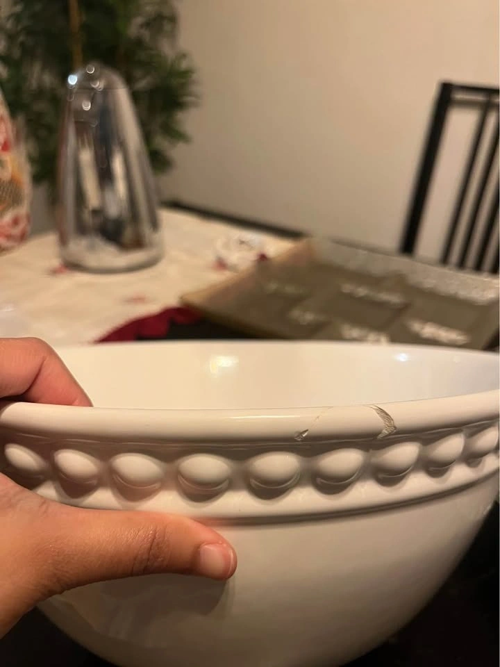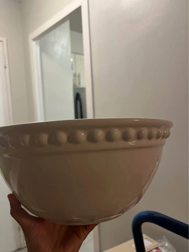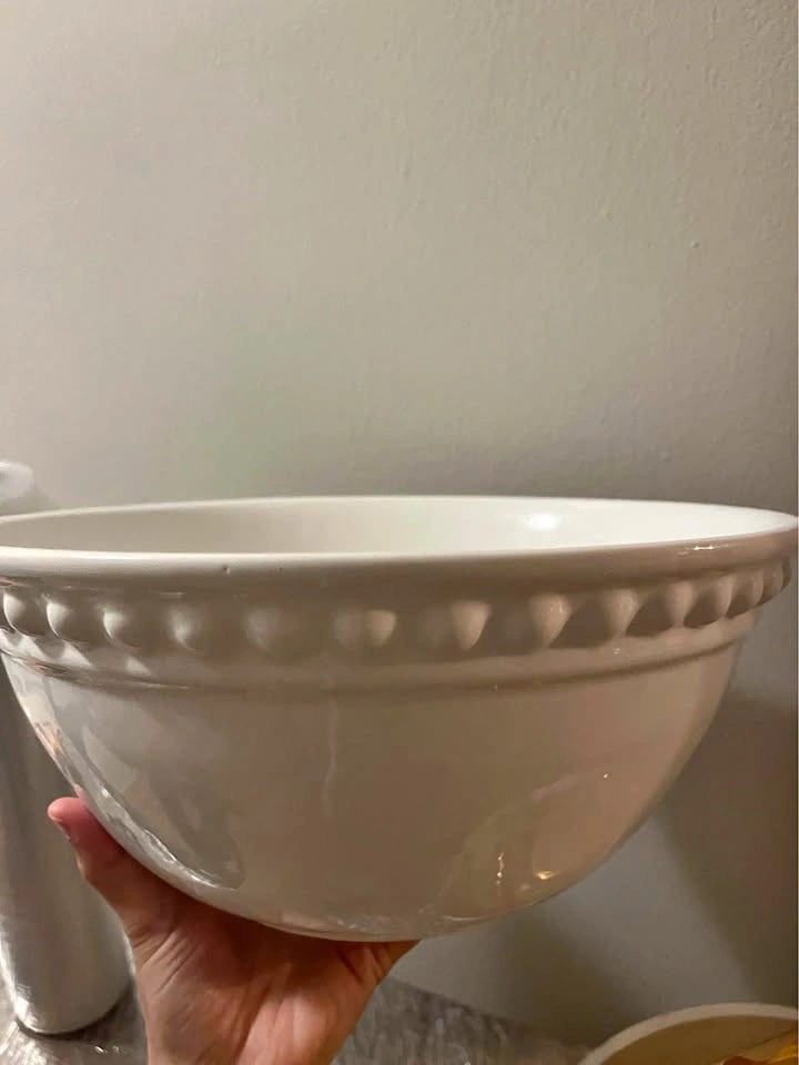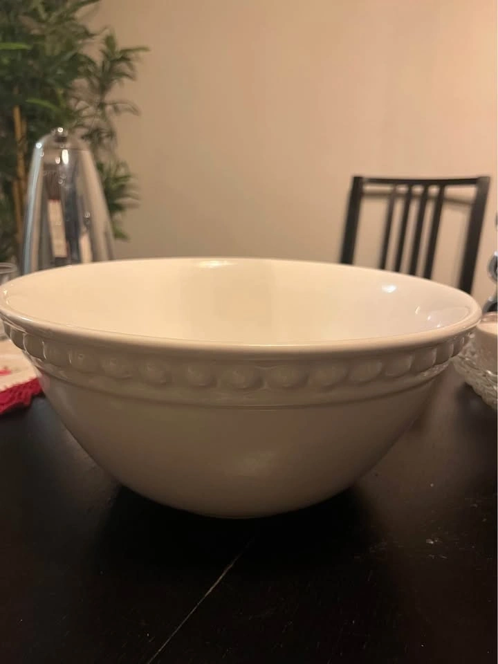 Large white serving bowl from HomeSense, only used once. Selling because the size is too big for my needs. Perfect for salads, pasta, or gatherings. Has a small scratch on the rim (shown in photo).