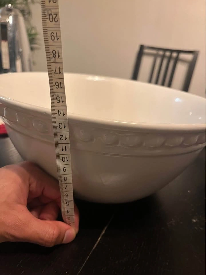 Large white serving bowl from HomeSense, only used once. Selling because the size is too big for my needs. Perfect for salads, pasta, or gatherings. Has a small scratch on the rim (shown in photo).