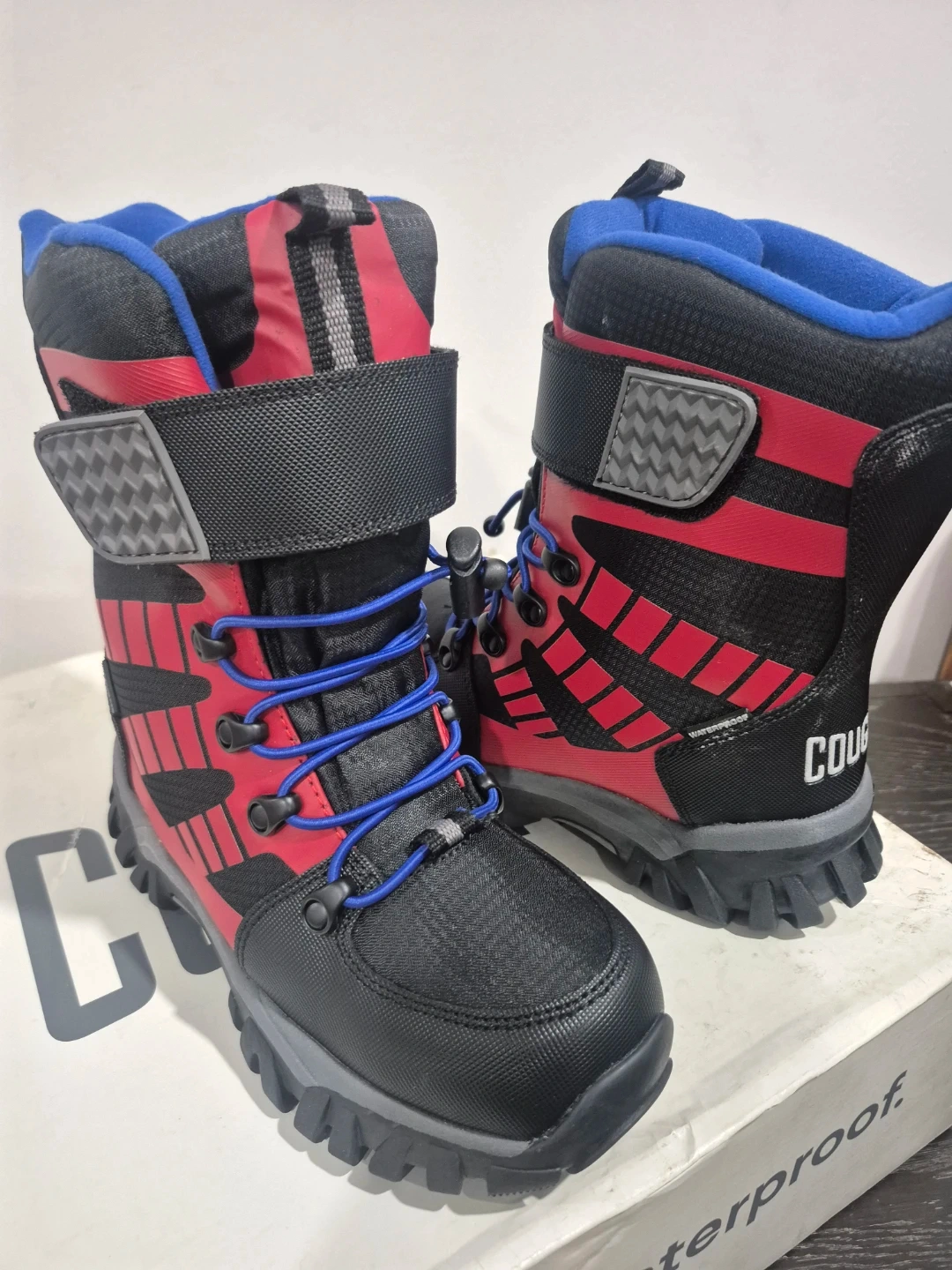 These Cougar Tango boots are designed for winter adventures. They're black and red with blue laces. Waterproof construction to keep feet dry and warm. Size is 2 (US).