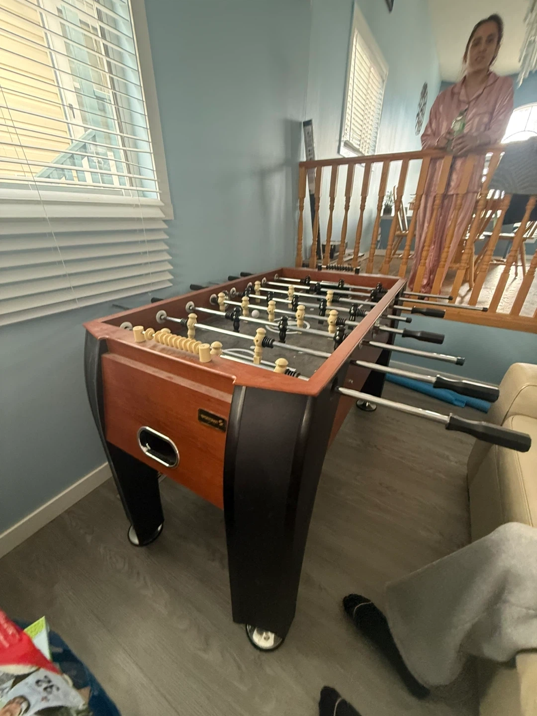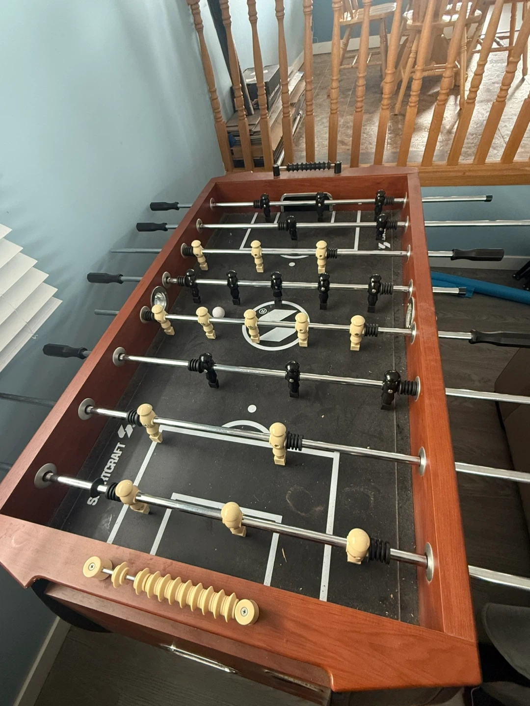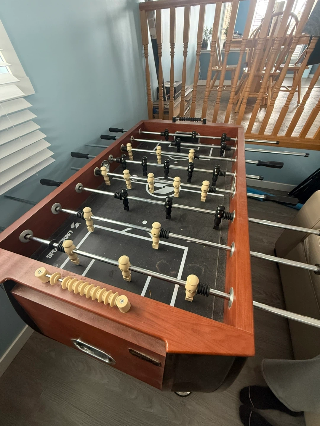 This Sportcraft foosball table has a rich wood finish. It's designed for indoor fun and features smooth-gliding rods. A great addition for game rooms or basements!
