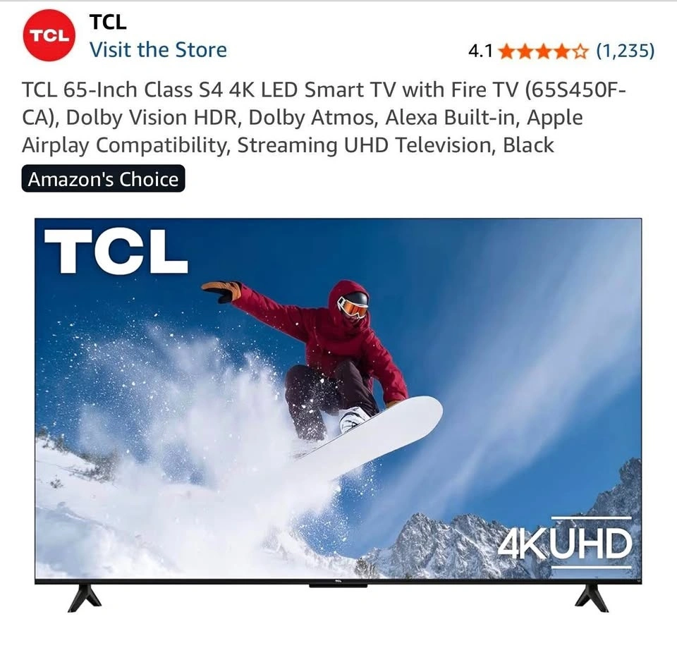 TCL 65-inch Smart TV in excellent, gently used condition. Features 4K Ultra HD resolution and a sleek, modern design. Includes remote control and power cable. Enjoy a large, crystal-clear display perfect for movies, sports, and gaming with vibrant colors and sharp picture quality. Access Netflix, YouTube, Prime Video, and more. Multiple HDMI ports. Selling because I'm moving.