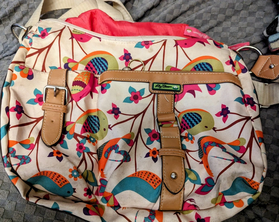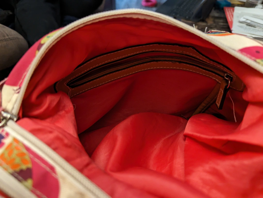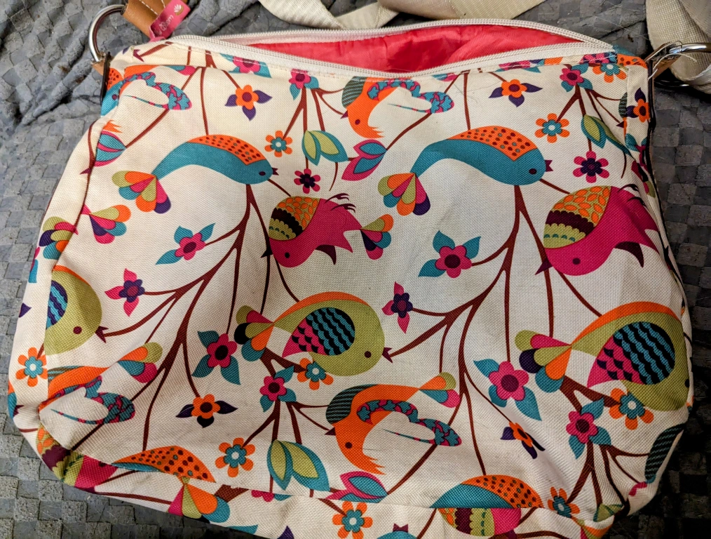 This bag features a beautiful bird and floral print on a cream background. It has a brown adjustable shoulder strap and a red lining. The inside of the bag has a zippered pocket and two slip pockets.