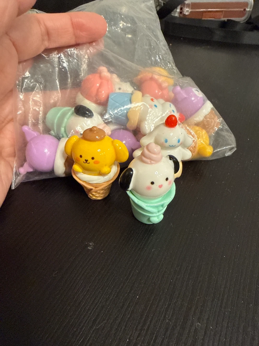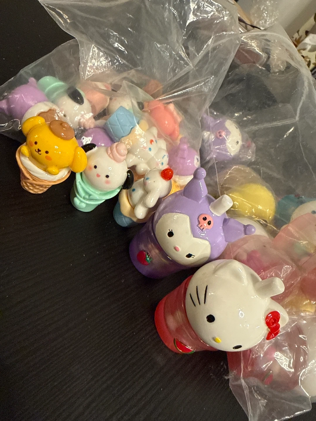 Assorted Sanrio character mini figures in a bag. Includes Hello Kitty, Cinnamoroll, Pompompurin, and My Melody.