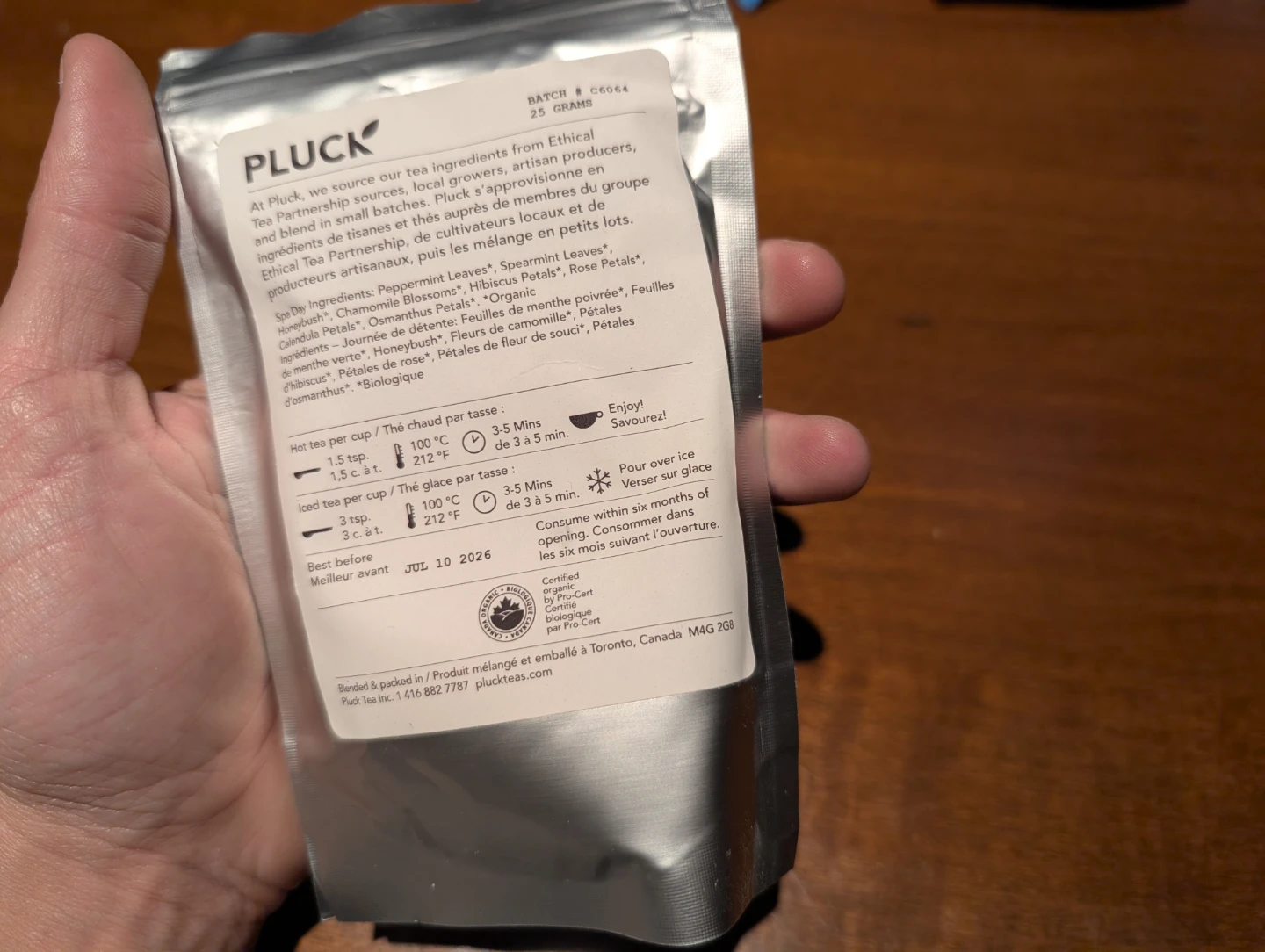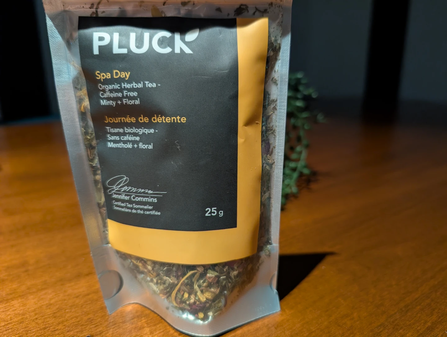 Pluck Spa Day Organic Herbal Tea. Caffeine-free and has a minty floral flavour. Best before July 10 2026