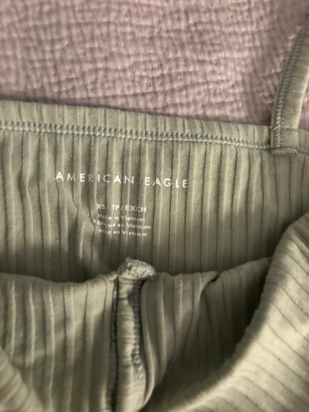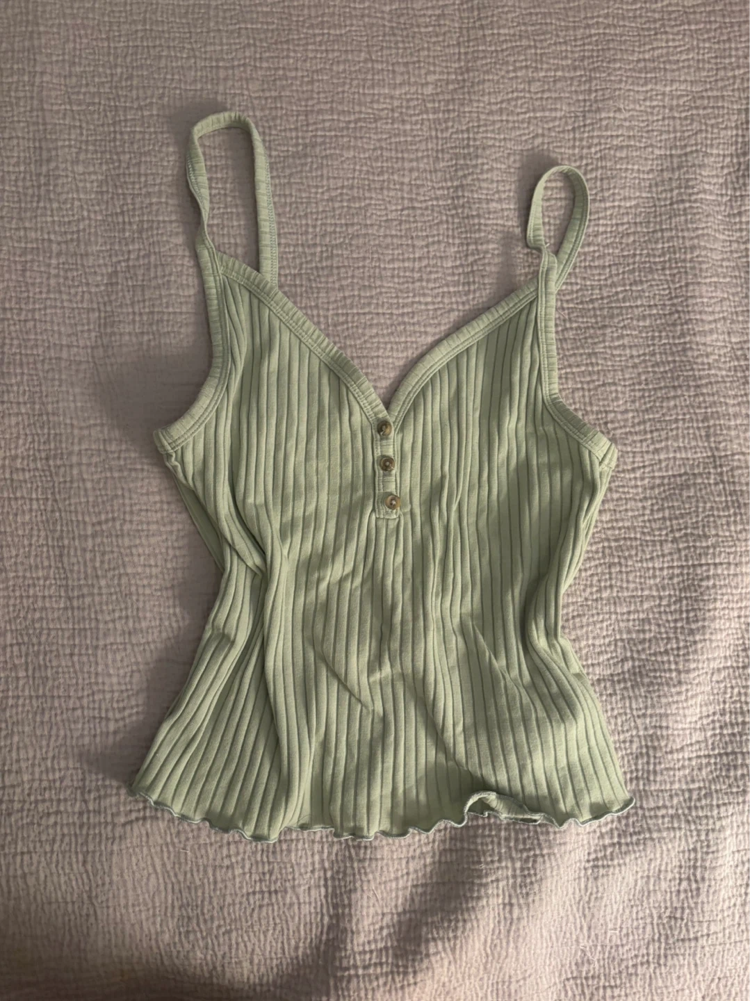 This is an American Eagle ribbed tank top. It's a size XS and features a button-up henley neckline. It's made with a stretchy ribbed material. Perfect for layering or wearing on its own!