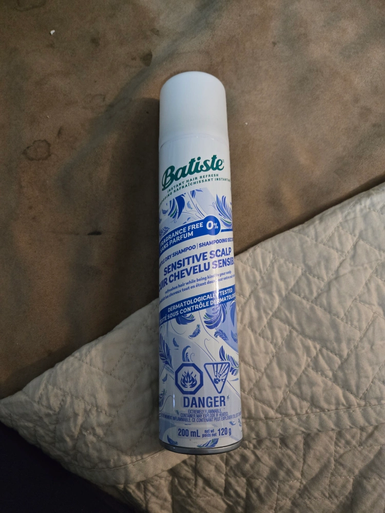 200ml can of Batiste dry shampoo. Fragrance free and formulated for sensitive scalps. Instant hair refresher.