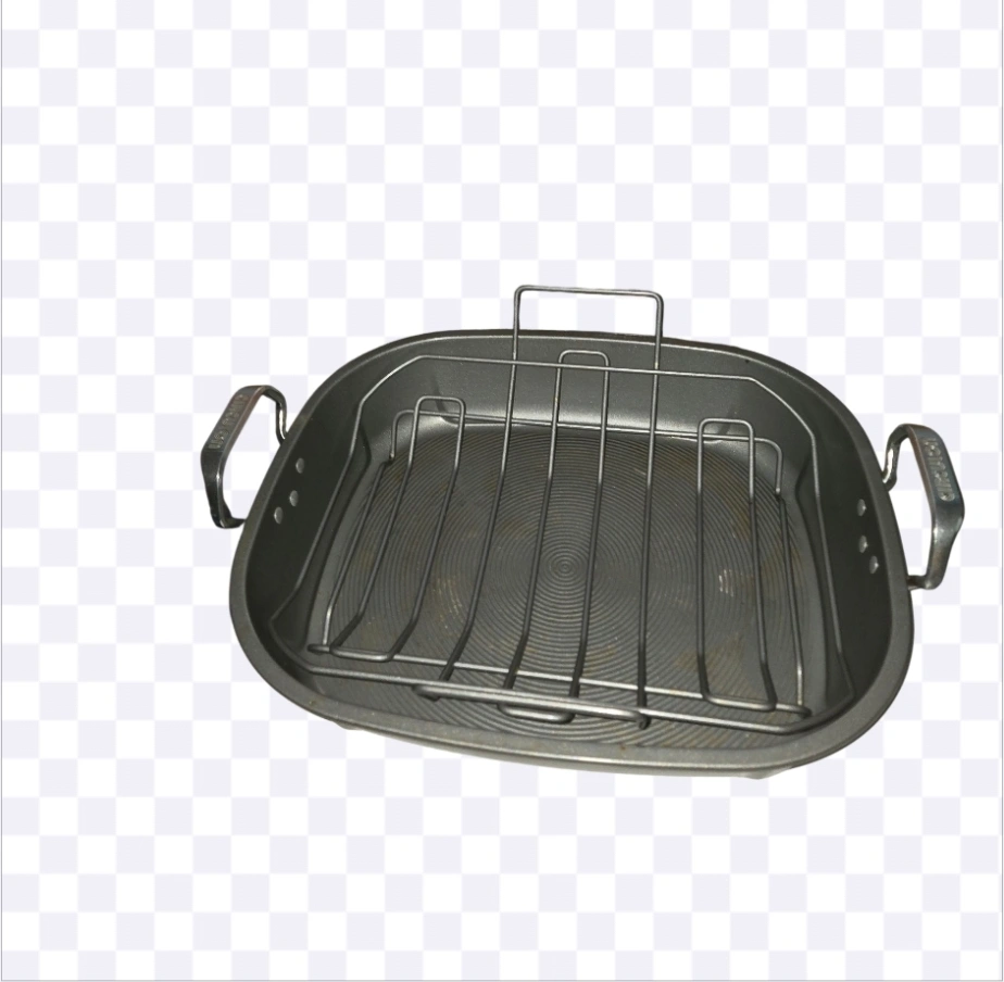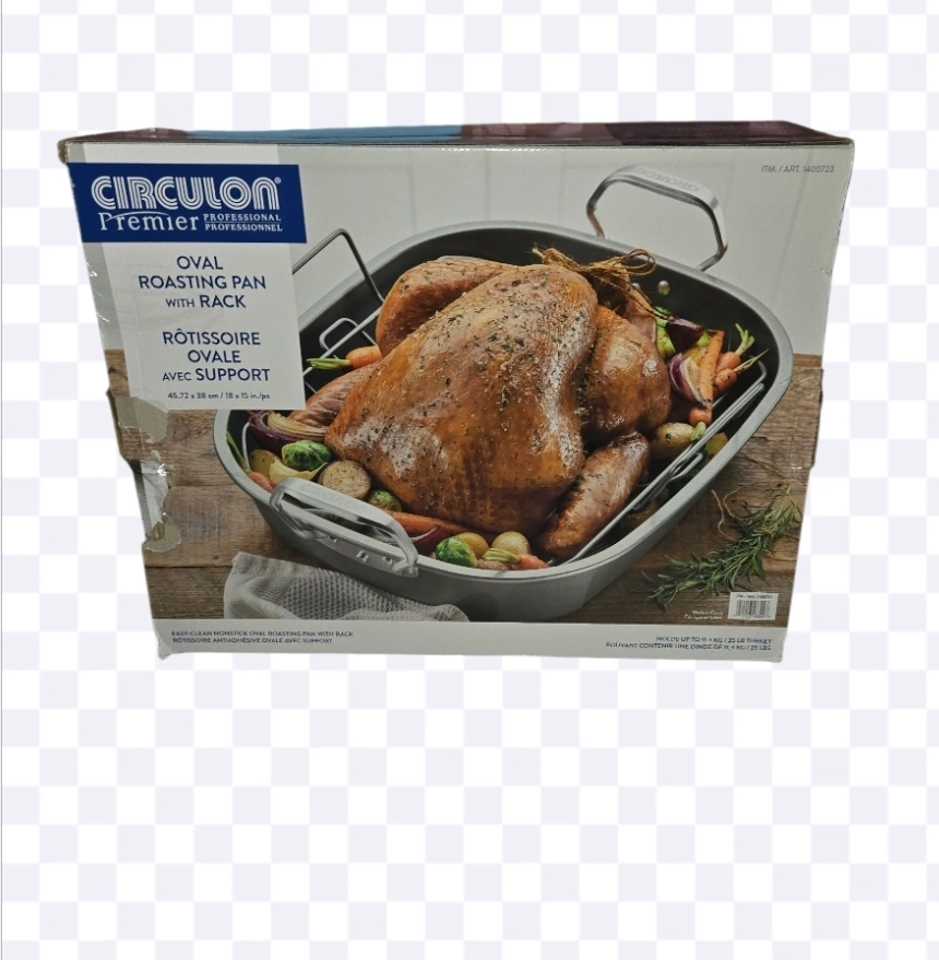 Selling a Circulon Premier Professional oval roasting pan with rack! It's a great roaster that is easy to clean, nonstick, and comes with a support rack. The dimensions are 45.72 x 38 cm / 18 x 15 in/po
