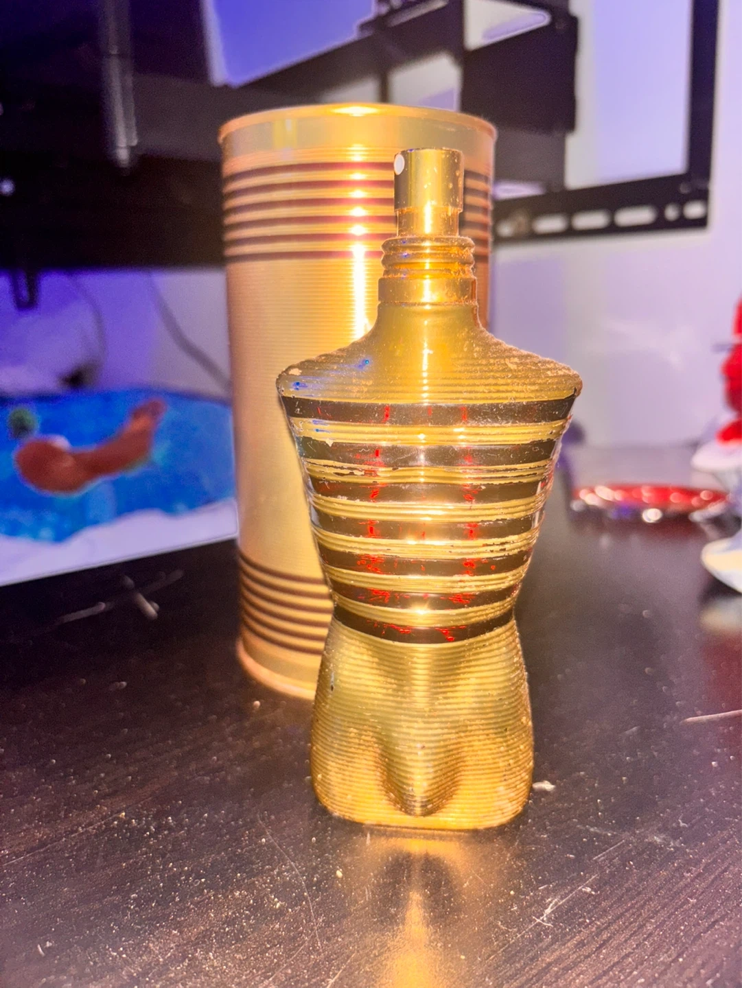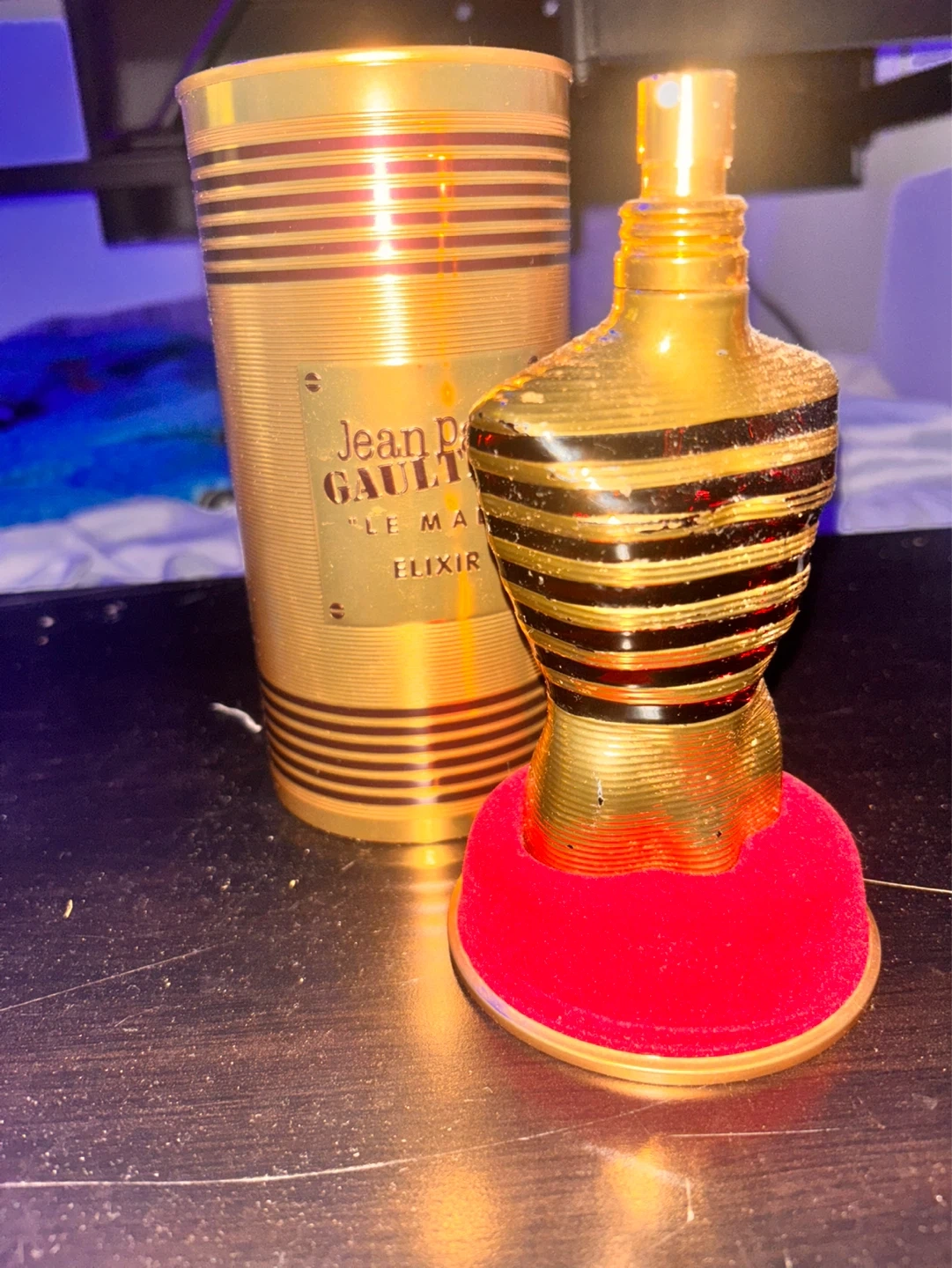 A bottle of Jean Paul Gaultier Le Male Elixir perfume. It's a gold-coloured bottle with black stripes, shaped like a torso. The original cylindrical container is also included. 75% full my mum doesn’t like the scent so I’m selling it
