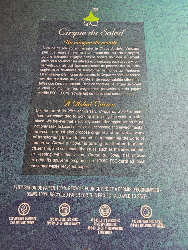 Selling a Cirque du Soleil Corteo Official Program. It's in great shape and would be perfect for any fan of the show! The program highlights the show's commitment to environmental sustainability, including its use of 100% FSC-certified post-consumer waste recycled paper