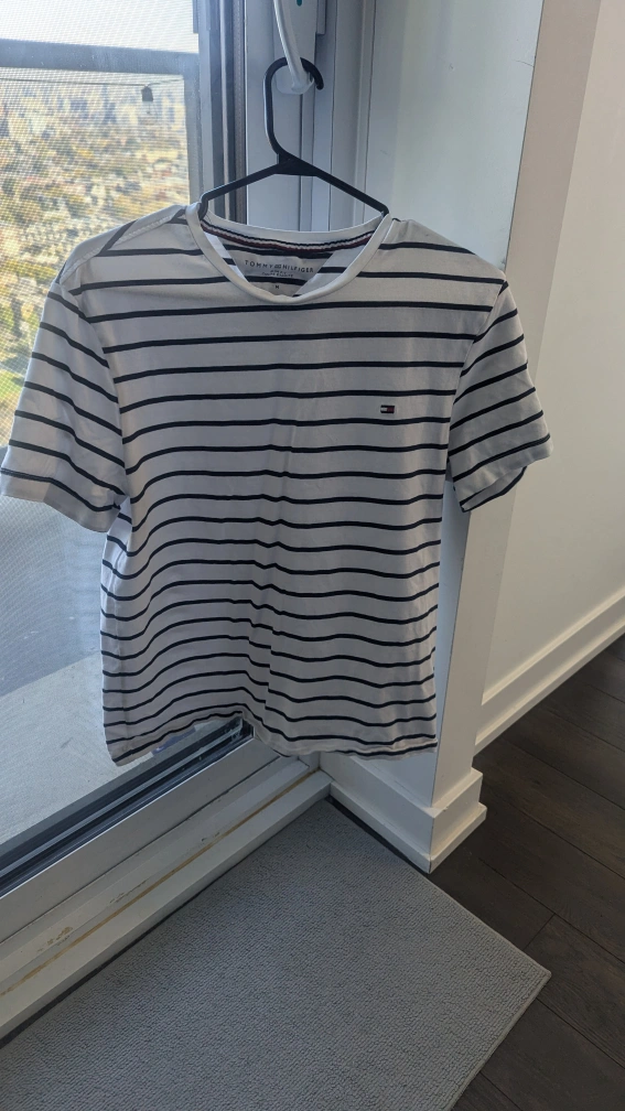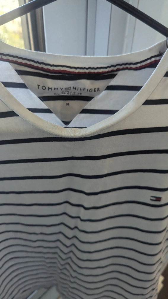 White and blue striped T-shirt with small Tommy Hilfiger logo on the chest. Size M.