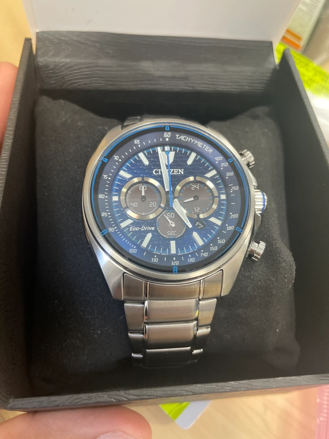 10Selling a Citizen Eco-Drive watch with a tachymeter. It features a stylish blue face and a stainless steel band. Comes with the original box!