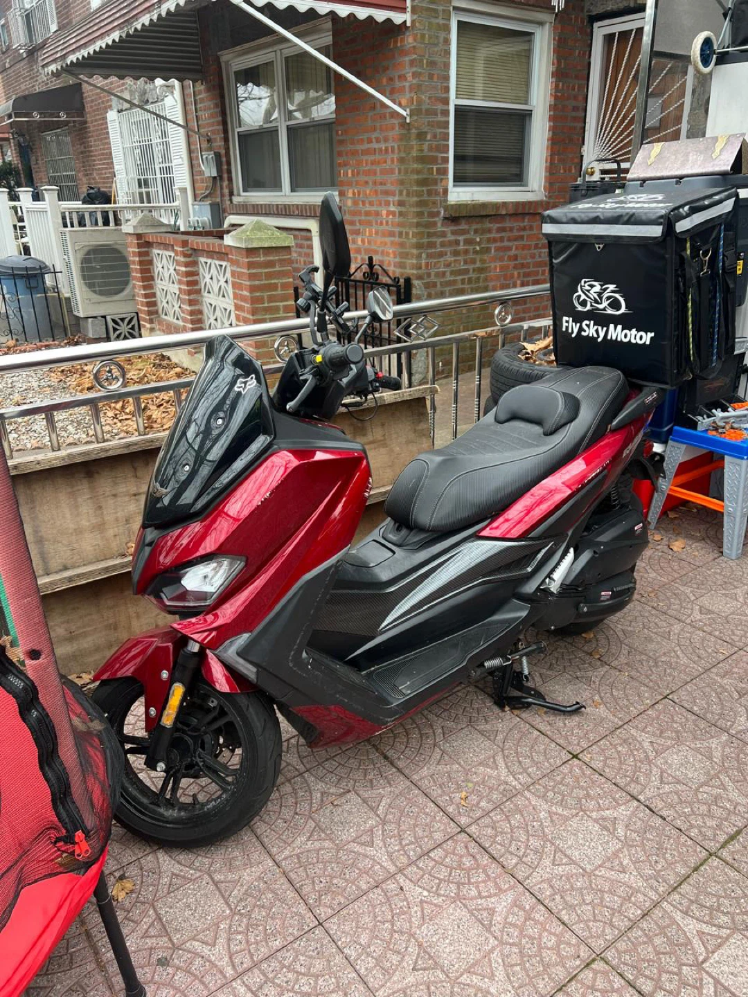 Selling a red Fly Sky Motor scooter. It includes a large black delivery box with the "Fly Sky Motor" logo. This scooter is ready for your deliveries! 5,000 miles