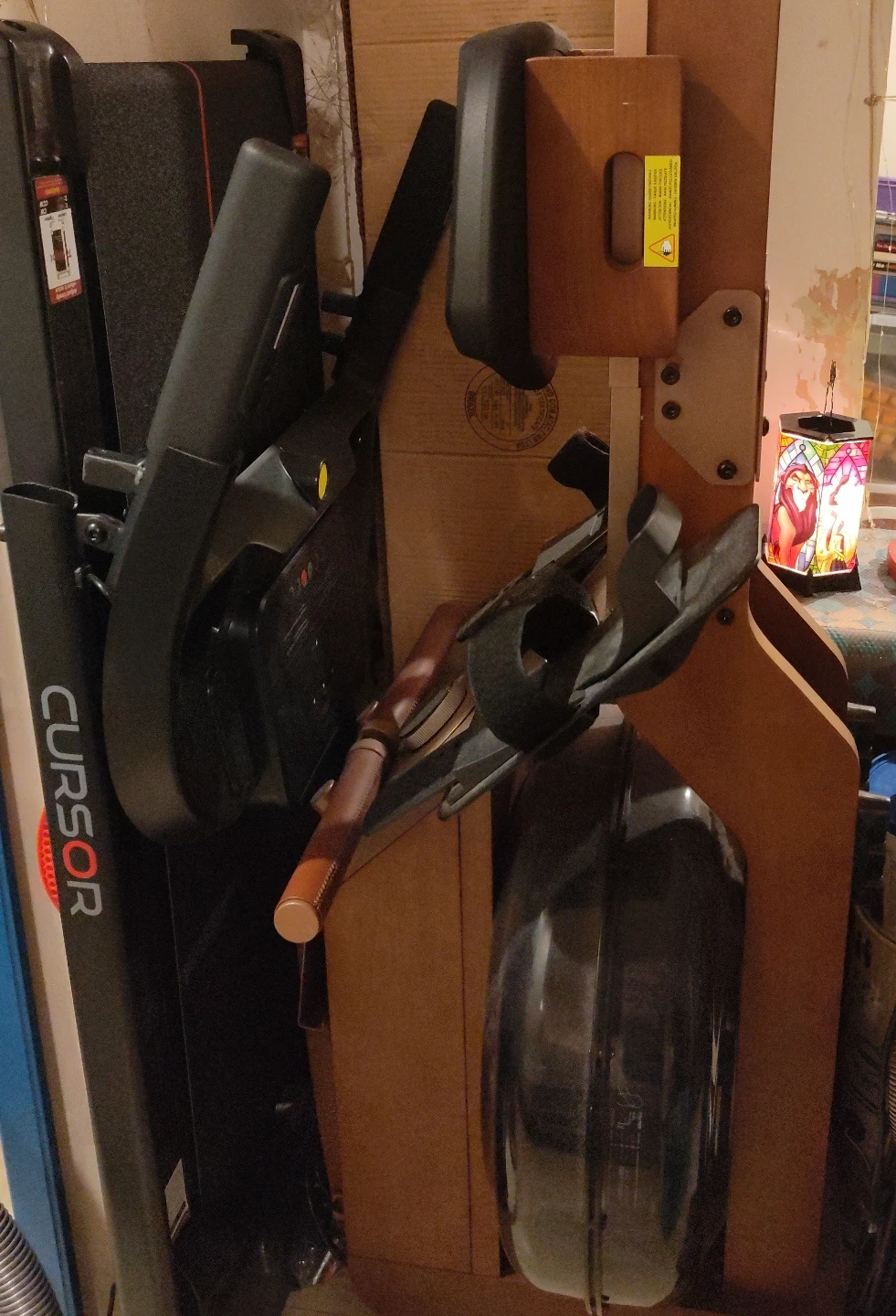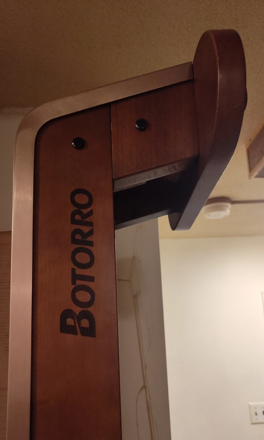 This is a BOTORRO water rower with a wooden frame. It's designed for a good workout. It includes the handle and seat assembly.
