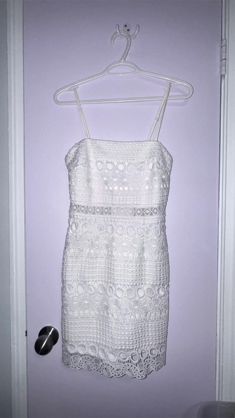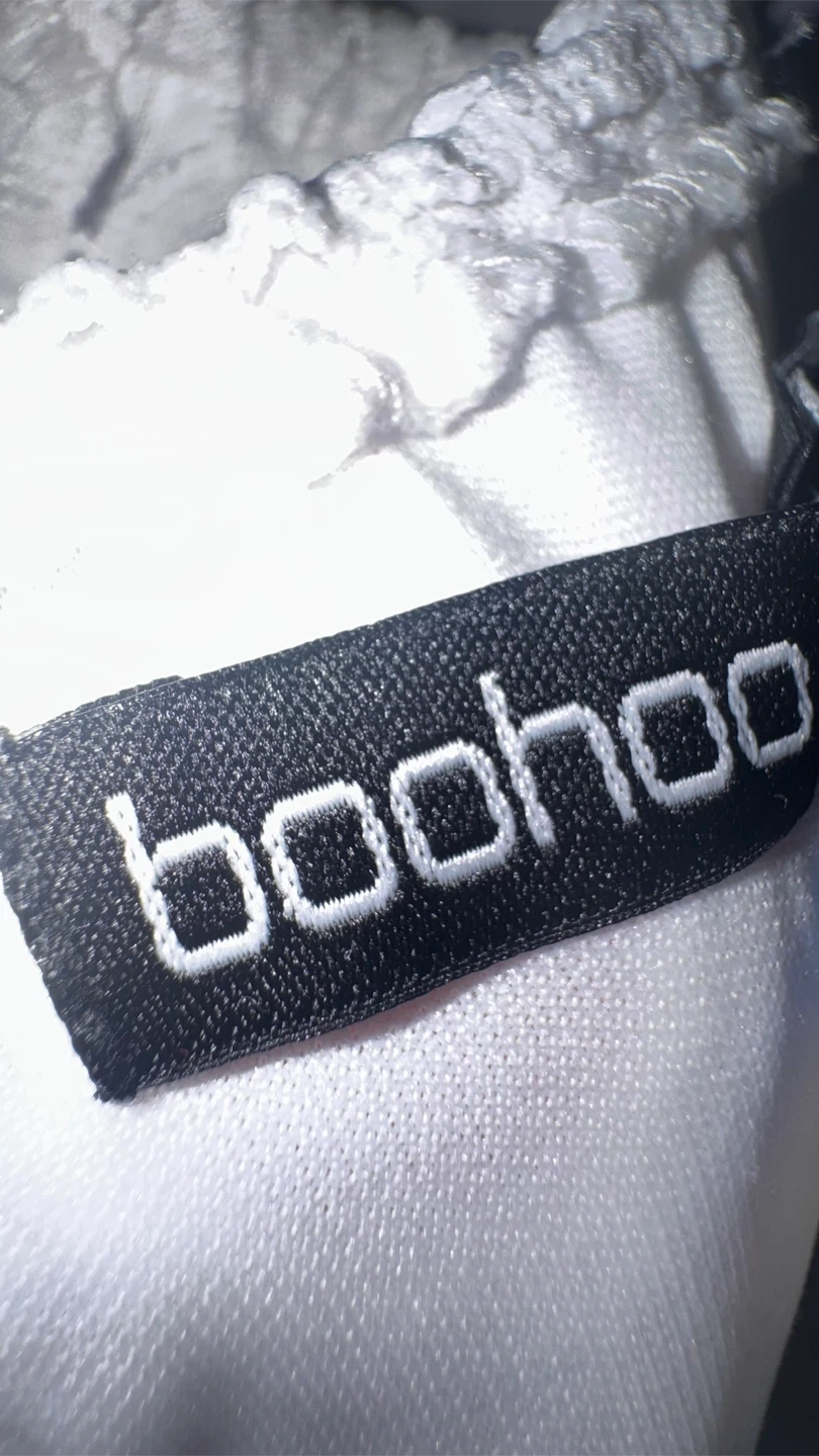 A lovely white lace mini dress from Boohoo. It features a square neckline and delicate lace detailing throughout. Perfect for a summer event or a night out!