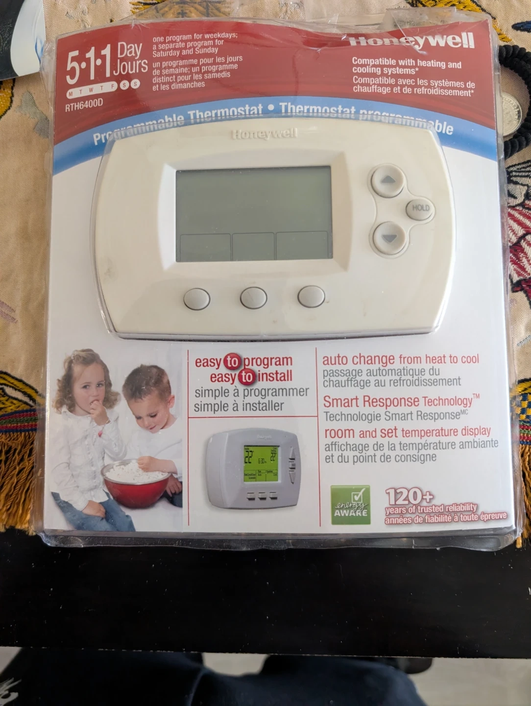 This is a Honeywell RTH6400D programmable thermostat. It's compatible with heating and cooling systems and offers a 5-1-1 day program. The thermostat provides room and set temperature display.