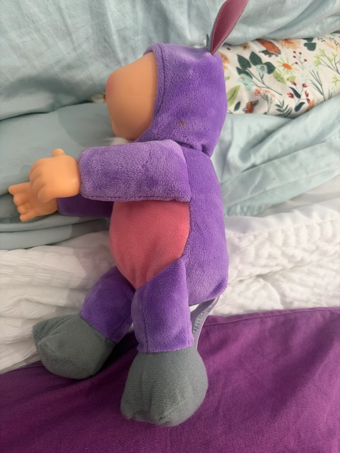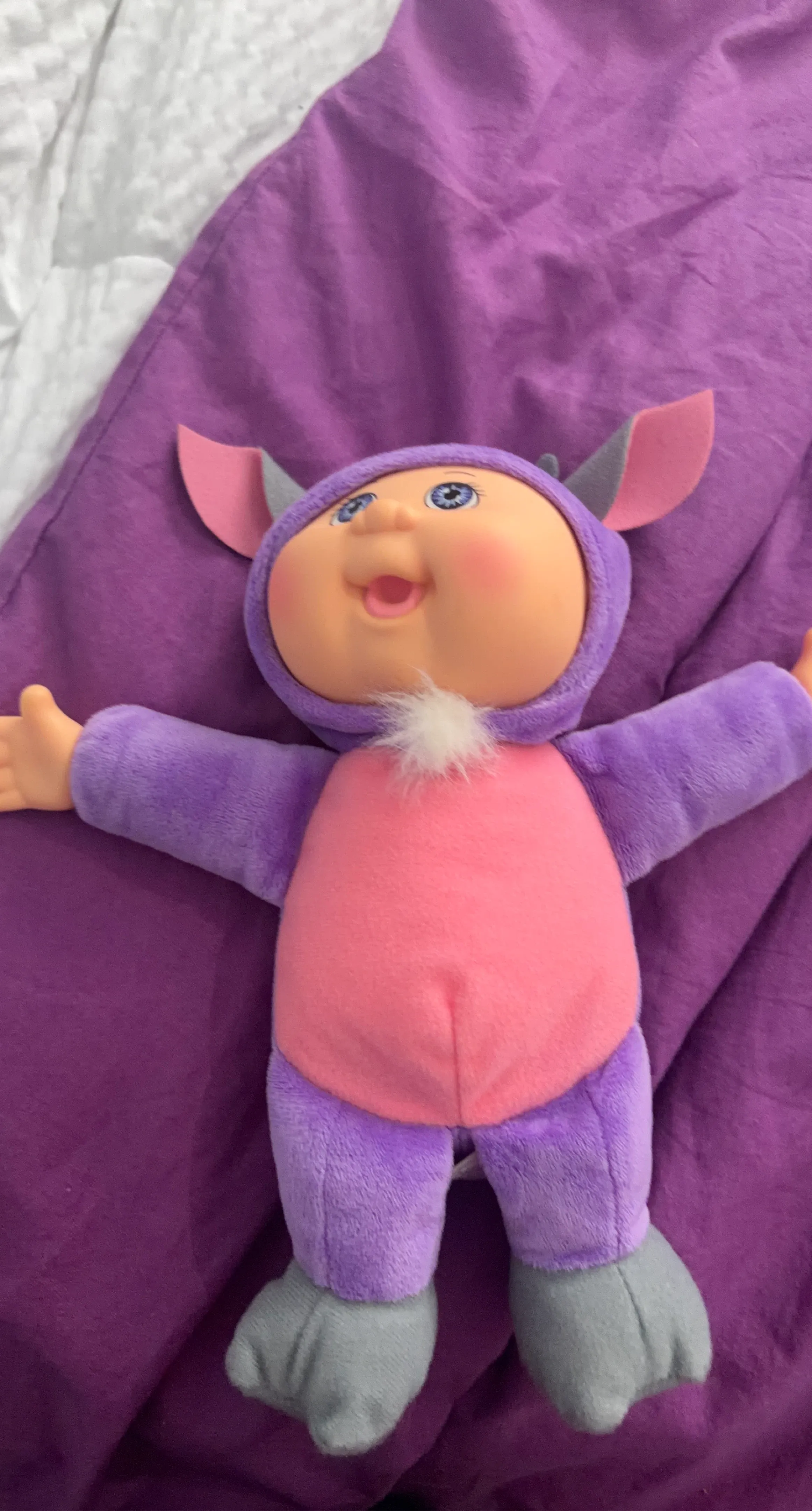 This is a Cabbage Patch Kids plush toy dressed in a purple and pink outfit with gray feet and ears. It's soft and huggable. Perfect for any Cabbage Patch Kids fan!