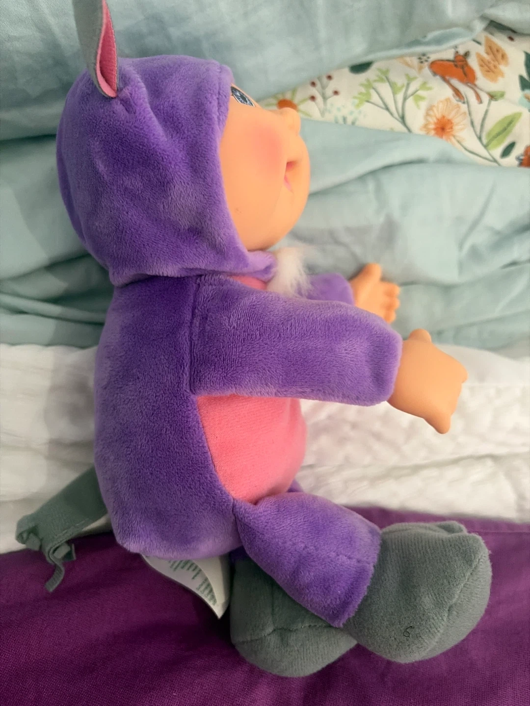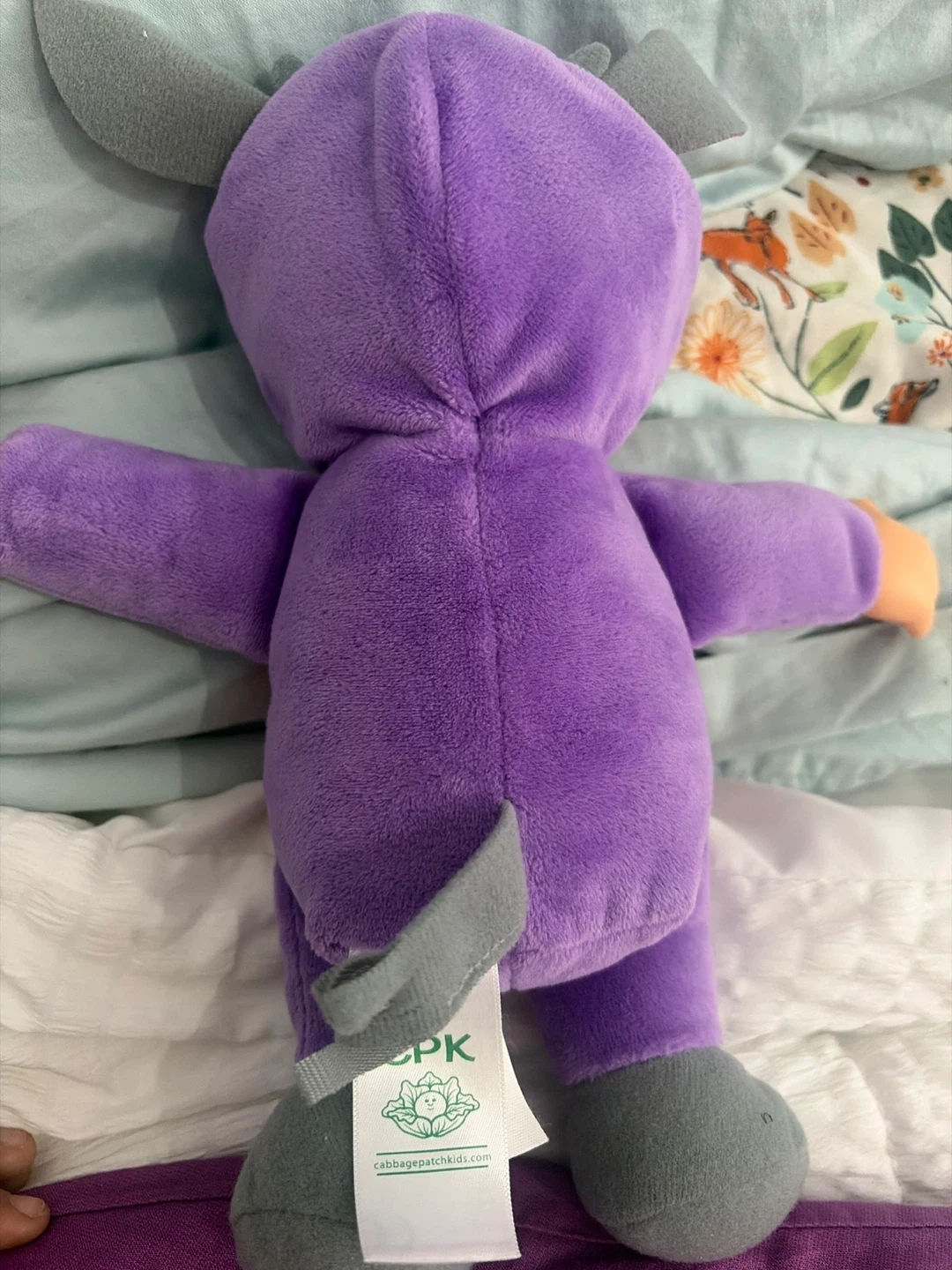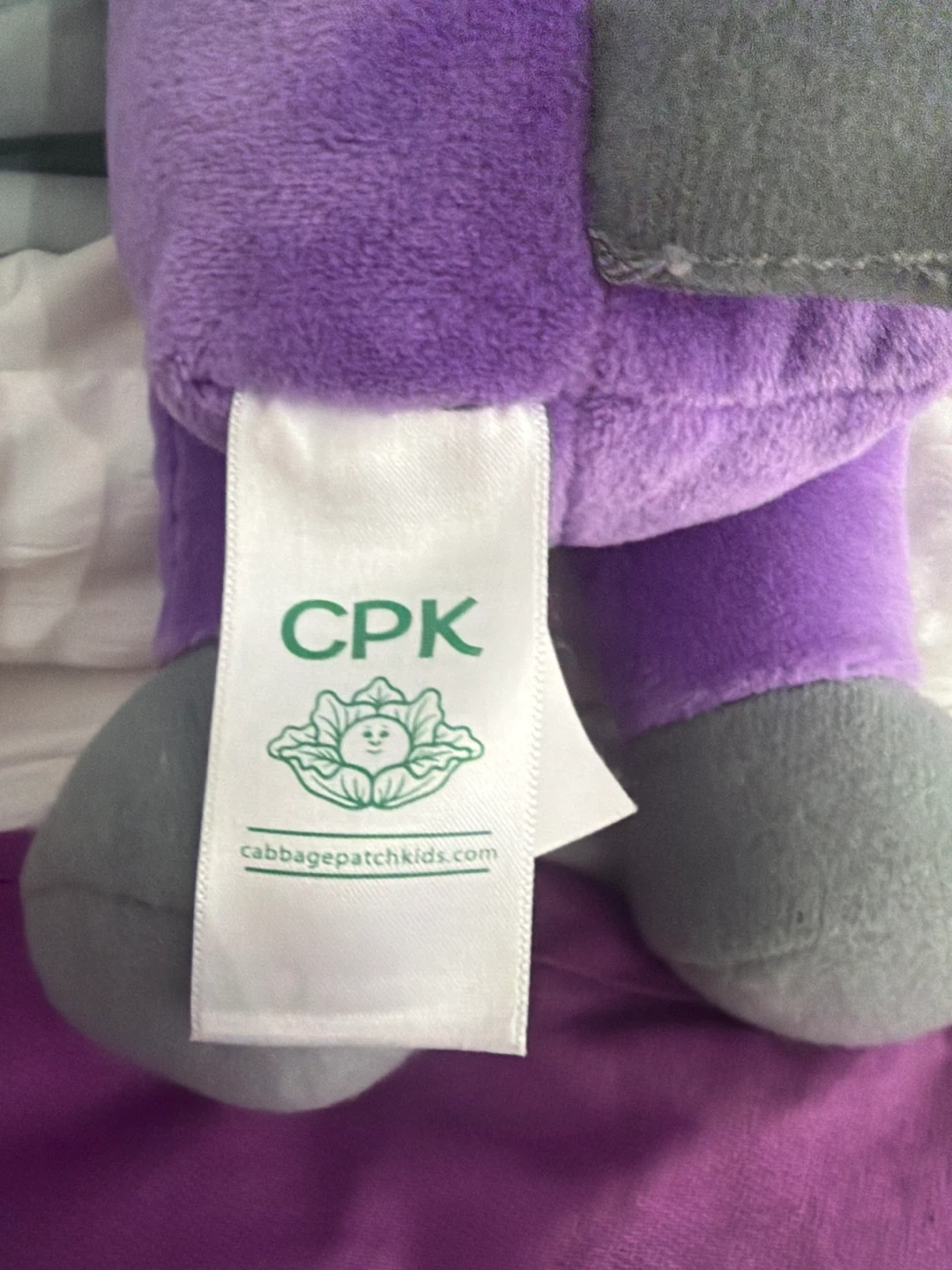 This is a Cabbage Patch Kids plush toy dressed in a purple and pink outfit with gray feet and ears. It's soft and huggable. Perfect for any Cabbage Patch Kids fan!